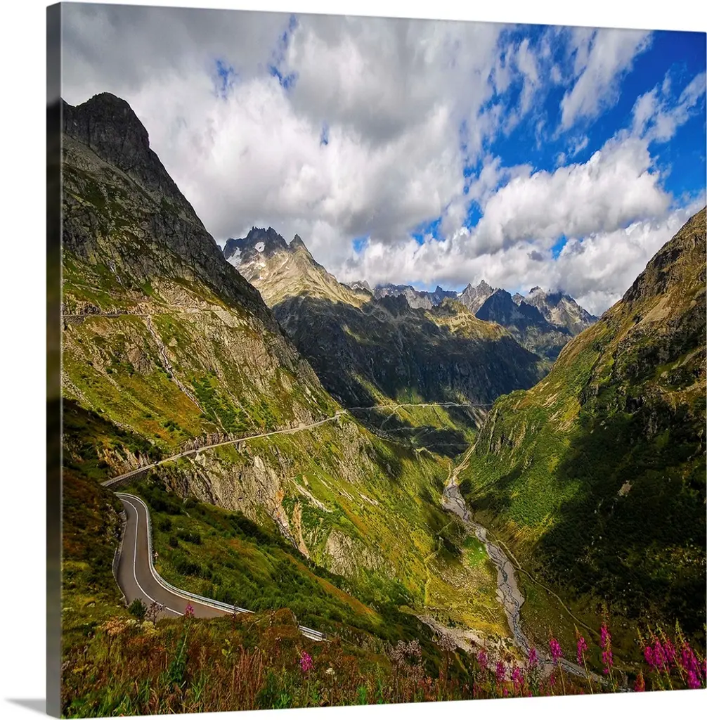 Winding road in a forest of Dolomite Alps against moody clouds, Northern Italy.