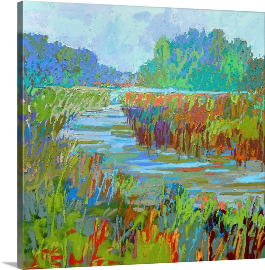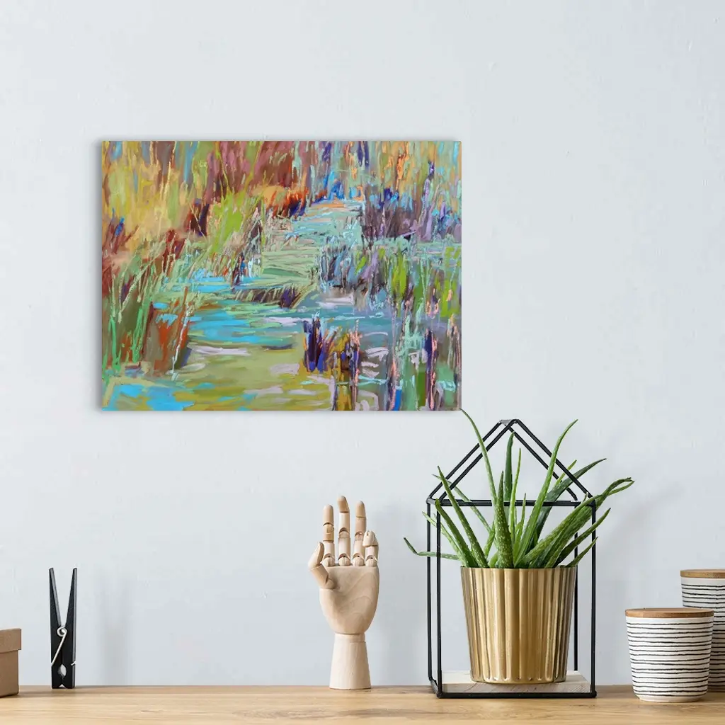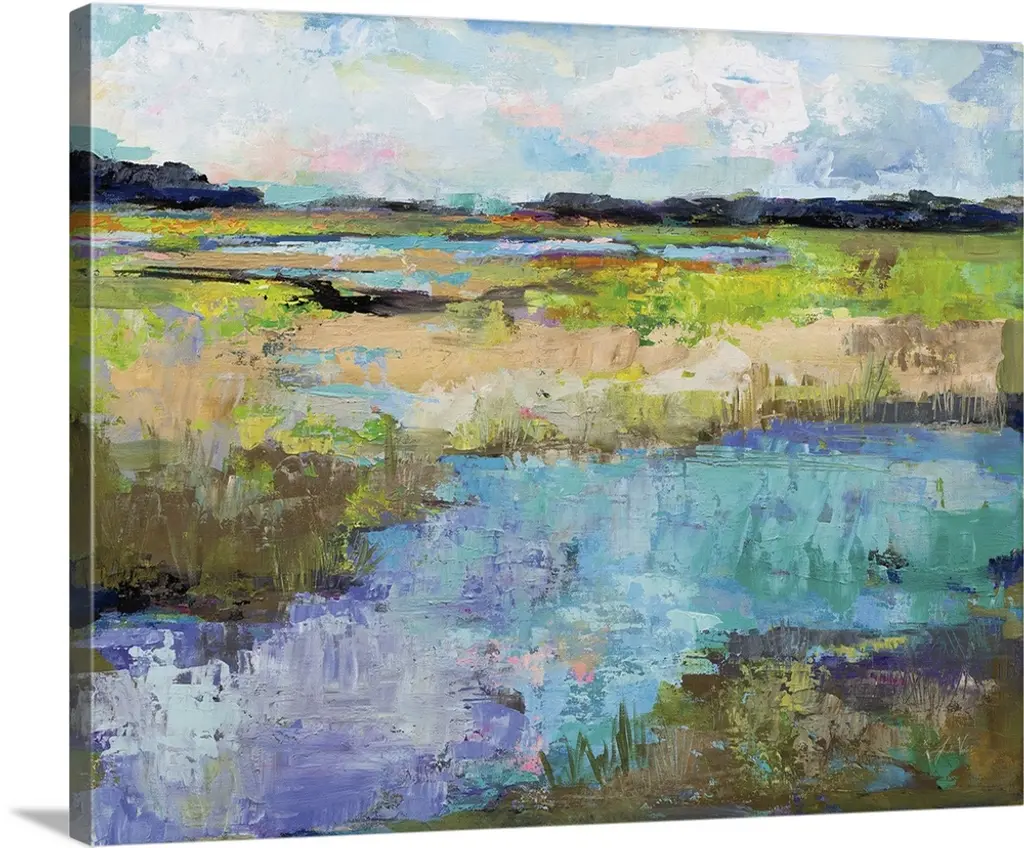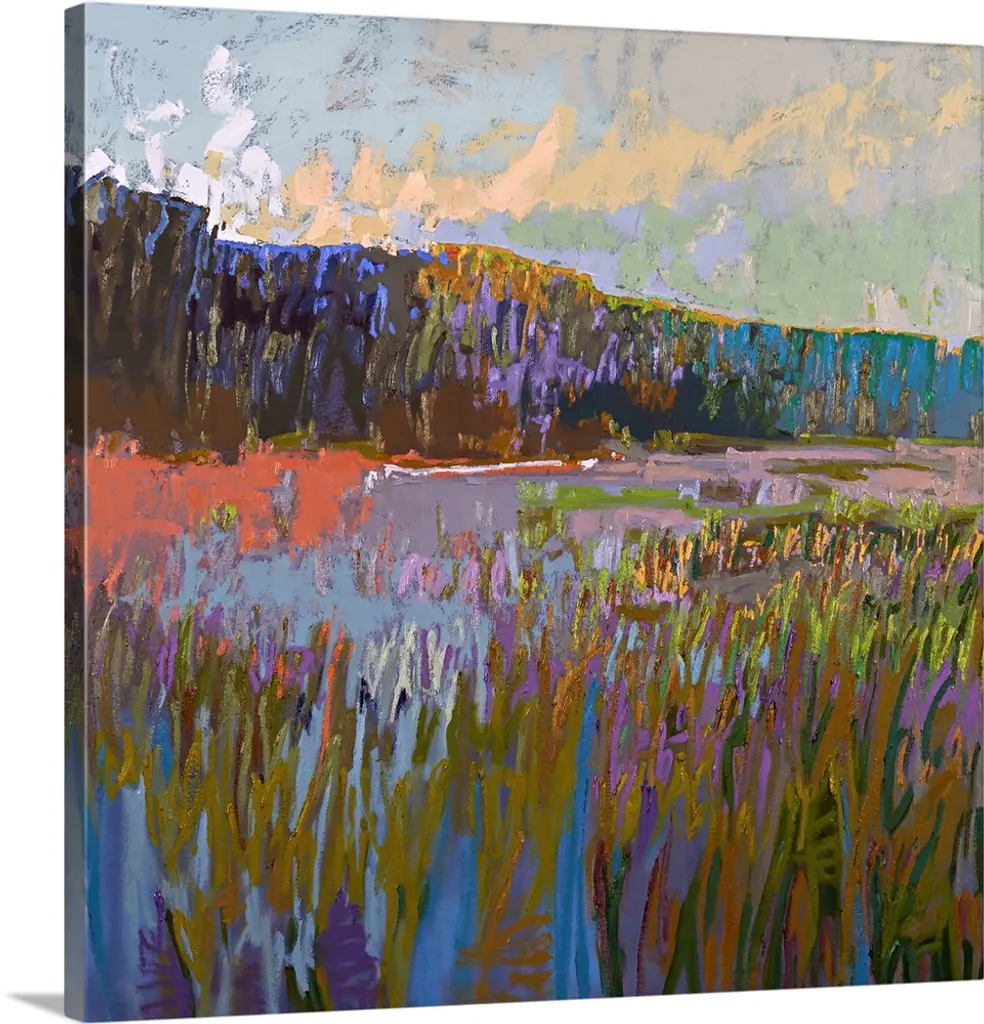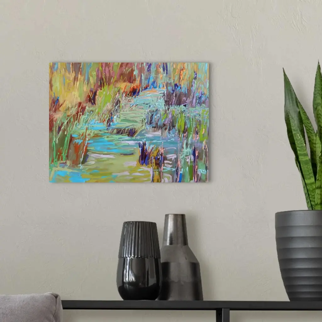 A horizontal abstract landscape of brush strokes of vivid colors.