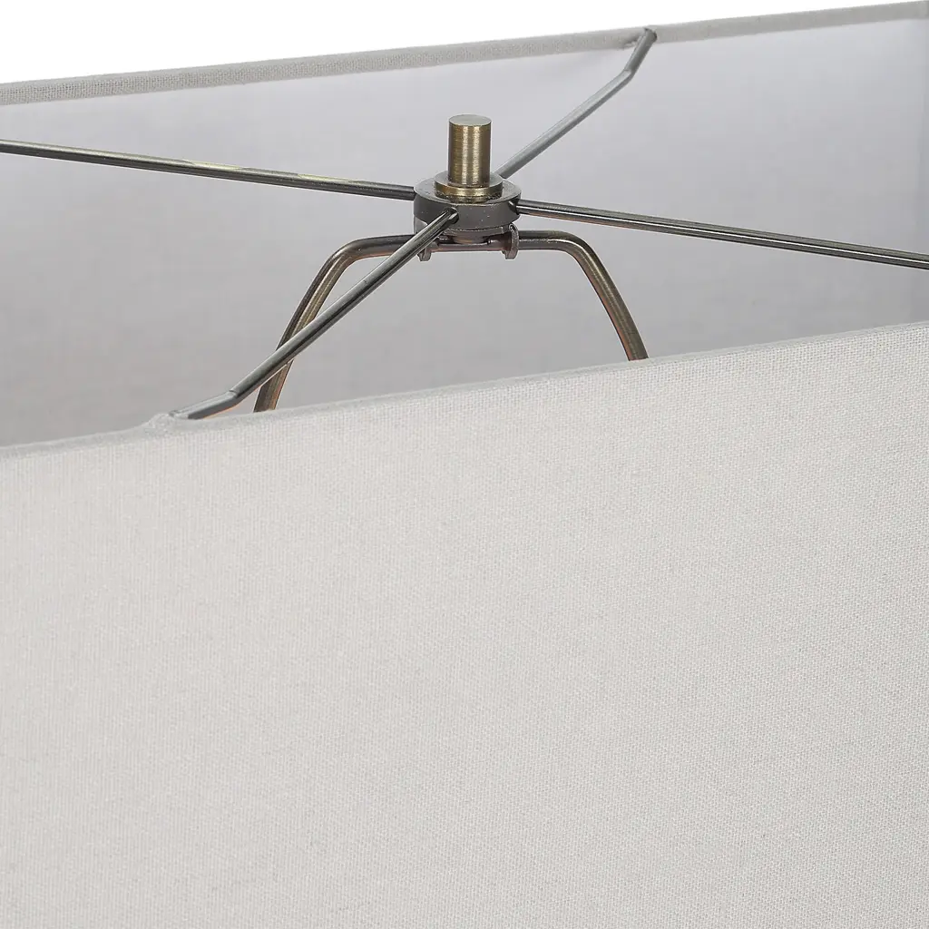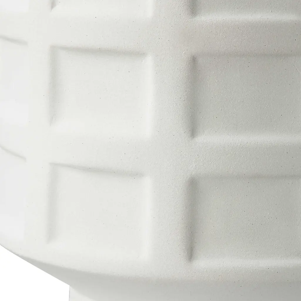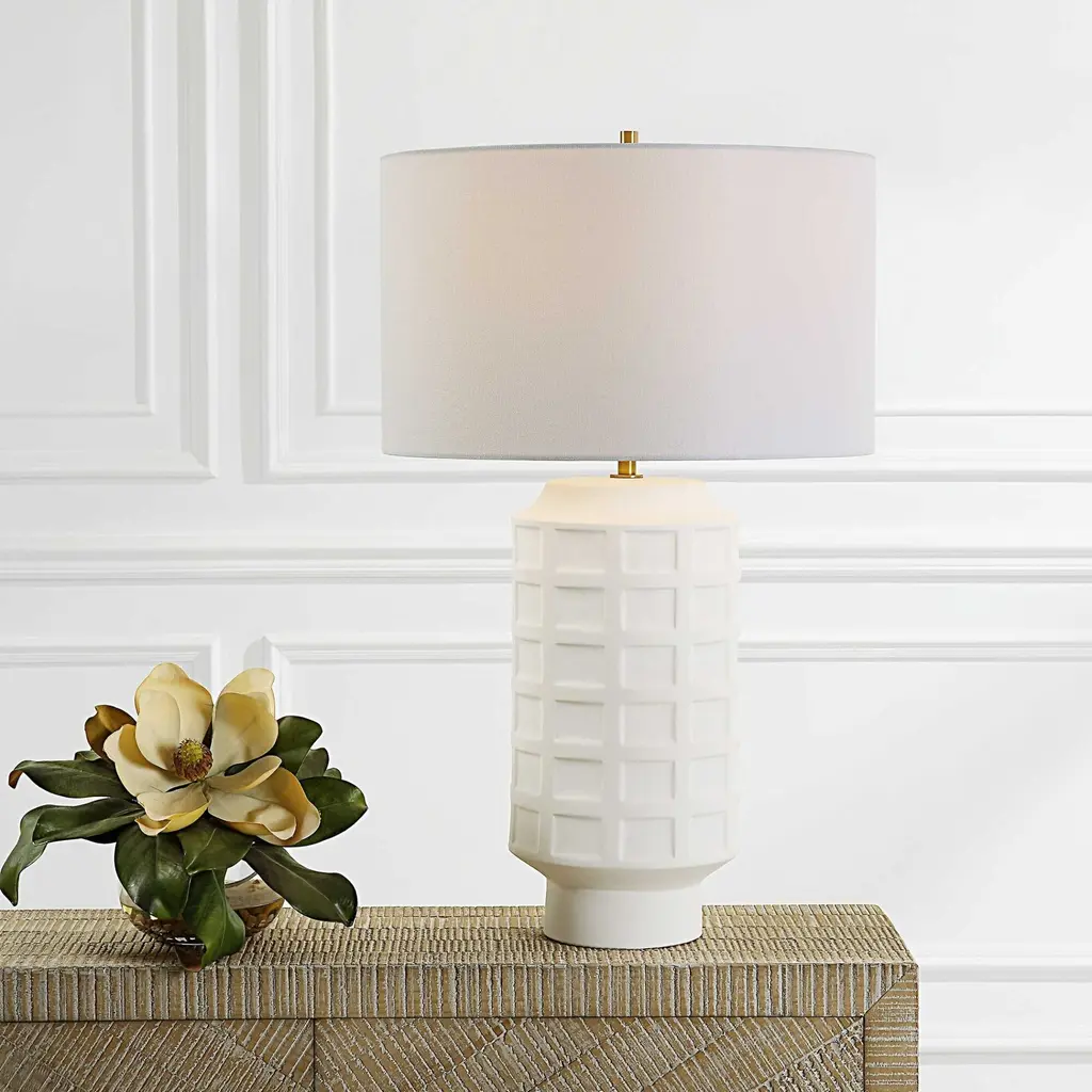 Elevate your decor with our contemporary table lamp, a modern masterpiece. Its base showcases an eye-catching repeating window pane pattern of embossed tiles, finished in a chalk white glaze, elegantly complemented by antique brass plated details. The round hardback drum shade, made from casual fabric, adds a touch of simplicity and sophistication. Illuminate your space with this unique and stylish lamp that seamlessly blends contemporary design with timeless charm. Product Features: White window pane pattern of embossed tiles table lamp Comes in chalk white glaze finish separated by a rustic uneven band Accented with antique brass plated details Round drum shade Is covered in a fabric Lamp uses (1) 150-watt E26 bulb - not included Socket type: 3-way Switch type: socket switch UL listed for indoor use only Dimensions: Overall height: 28" high Base diameter top dimension: 8" Base diameter bottom dimension: 5.5" Shade dimensions: 10" high x 17" diameter Material(s): iron/ceramic/linen fabric