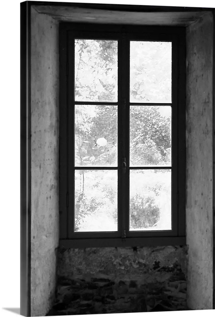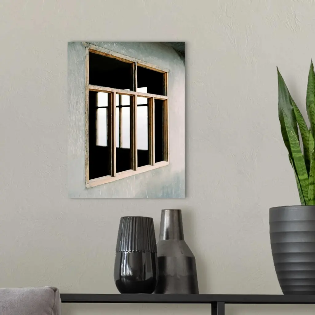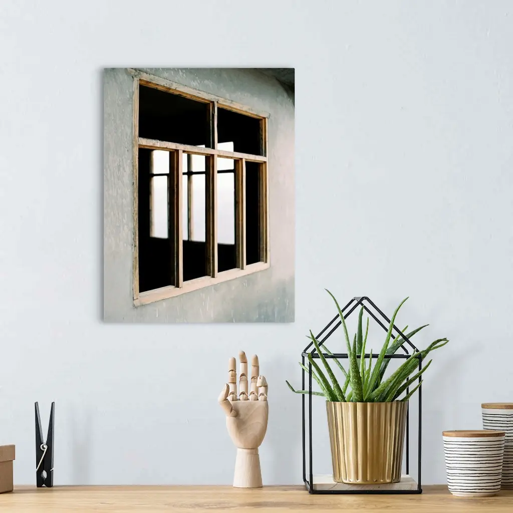 A poetic photograph of simple wooden window frames in a stucco wall.