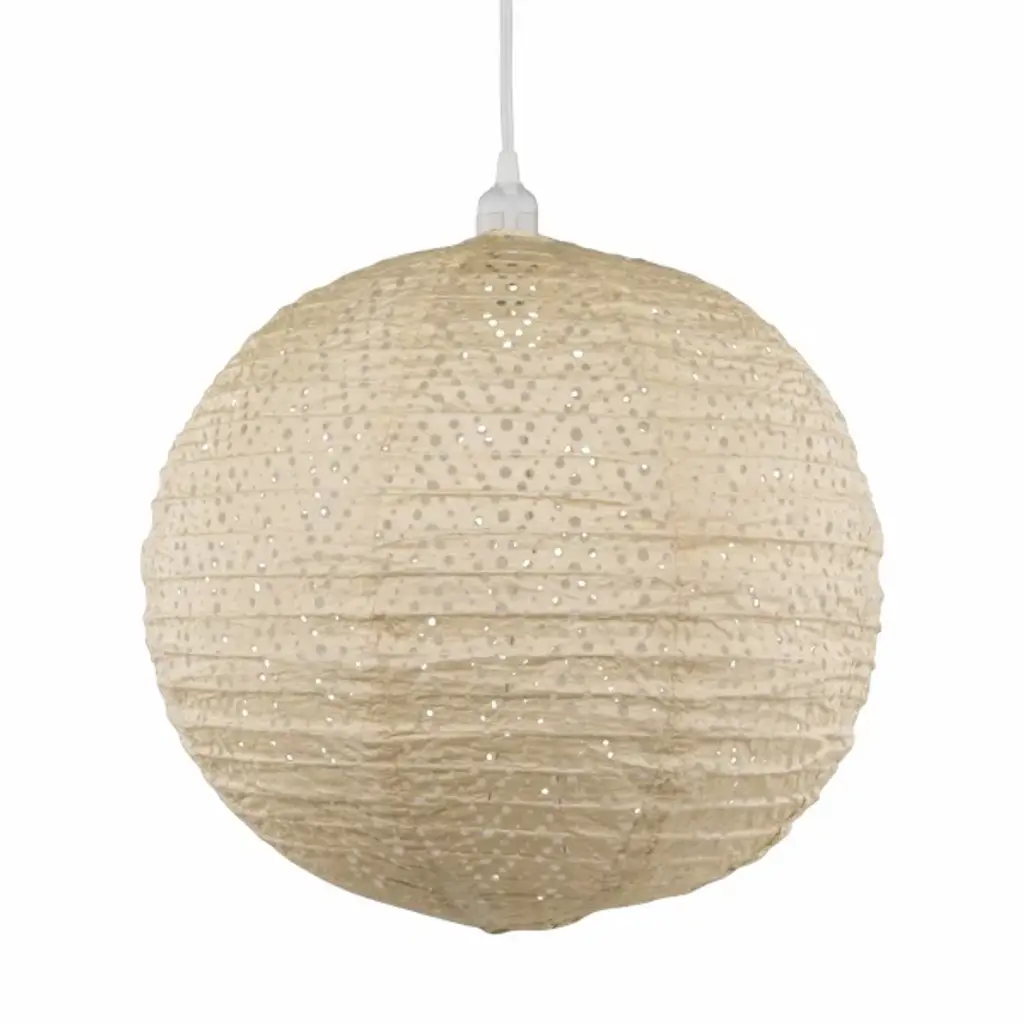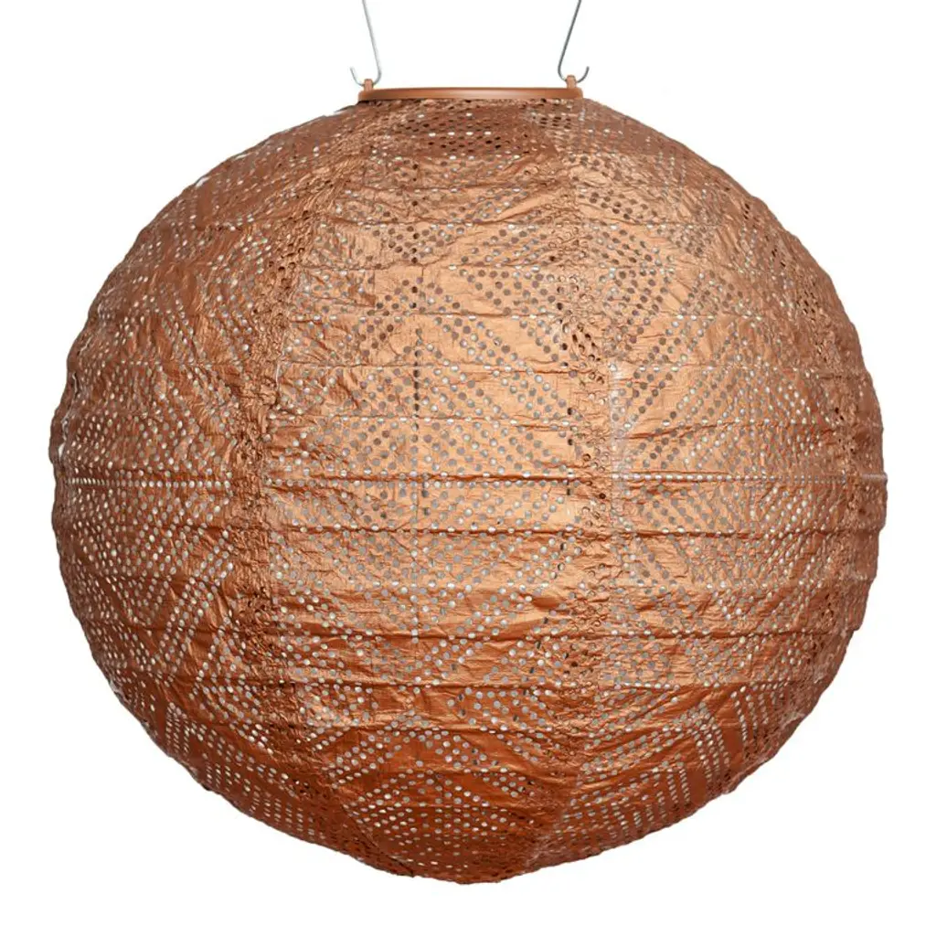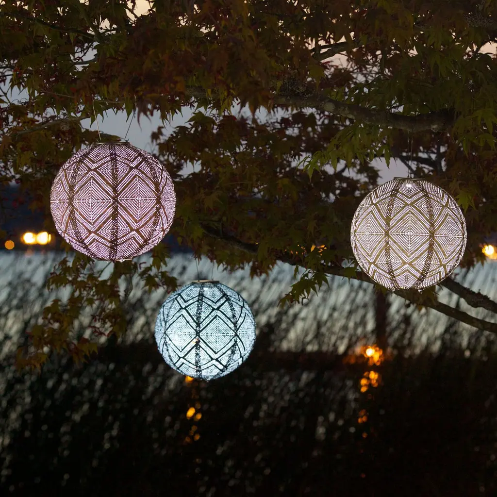 Handmade of durable fabric, this round solar-powered LED lantern shines light through an intricately punched diamond pattern inspired by Mediterranean lamps. Equipped with a stainless-steel hanging handle, this weather-resistant outdoor light soaks up sunlight for automatic illumination after dark. In three coordinating hues, this glowing lantern creates a festive atmosphere hung in multiples around your outdoor entertaining space.