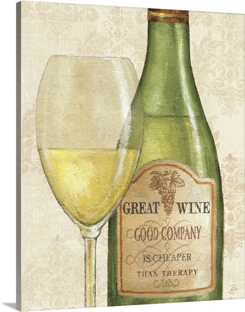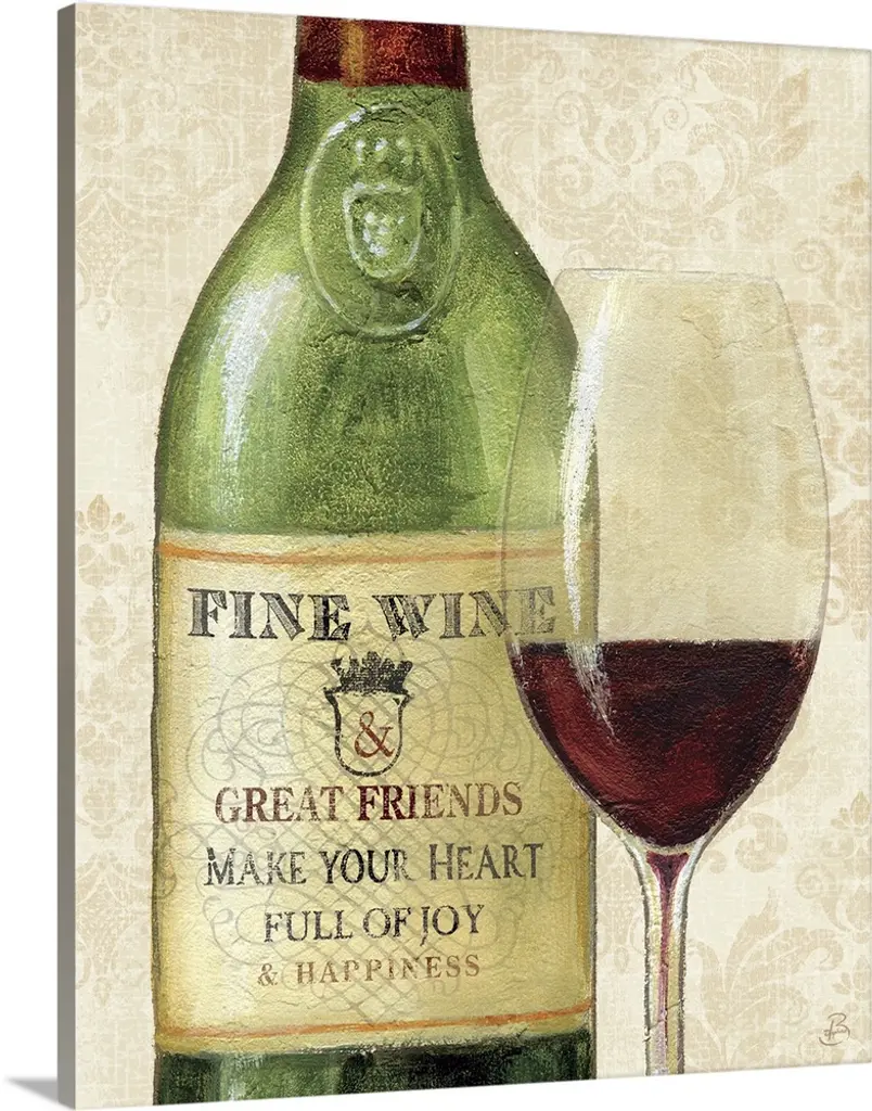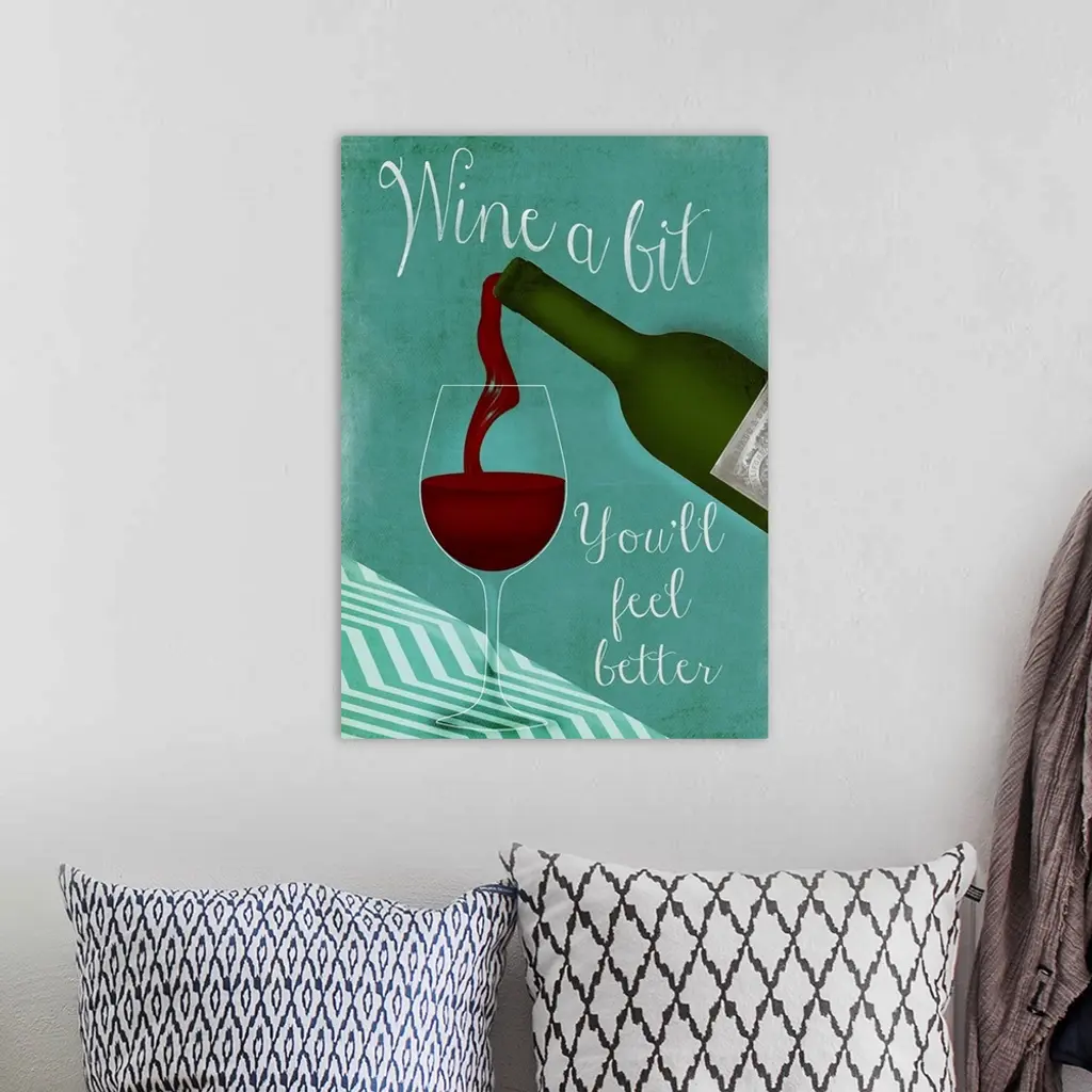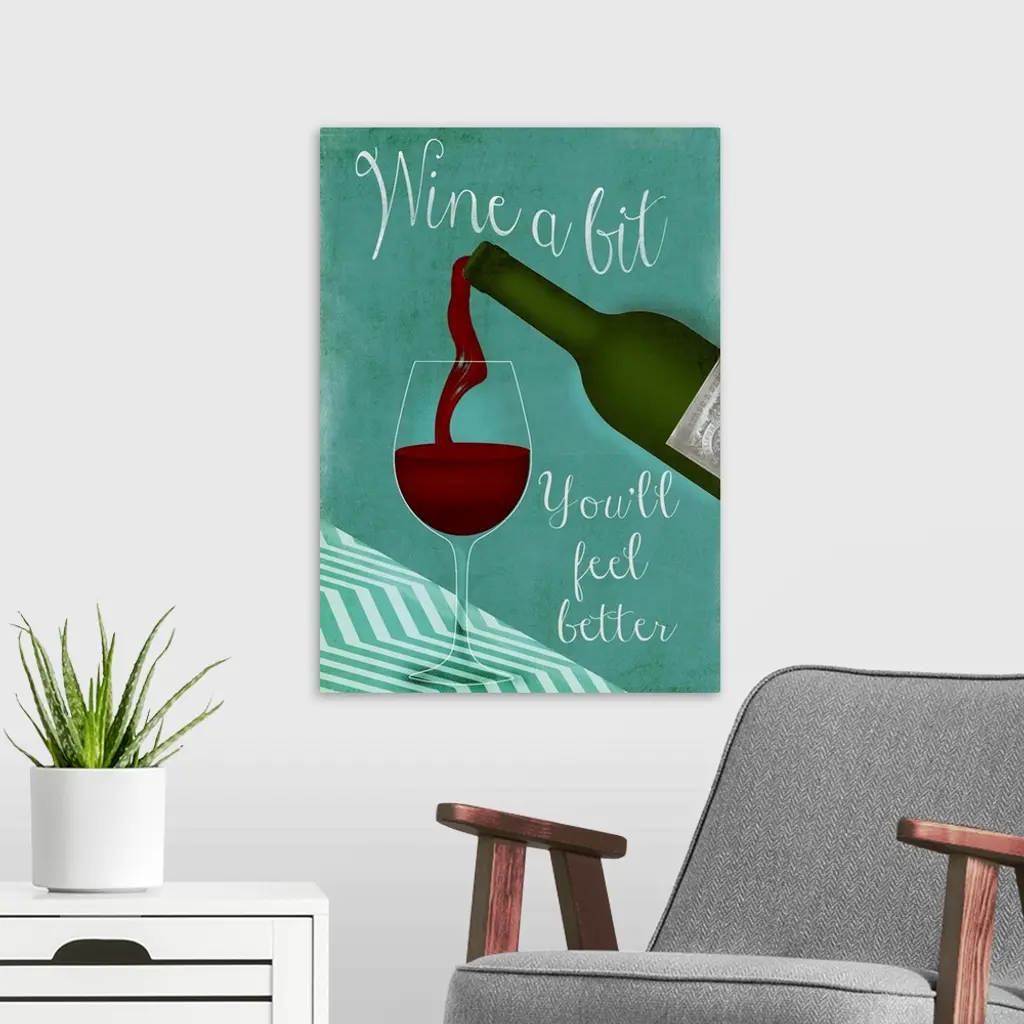 Kitchen decor of a bottle of wine pouring a glass with humorous text.