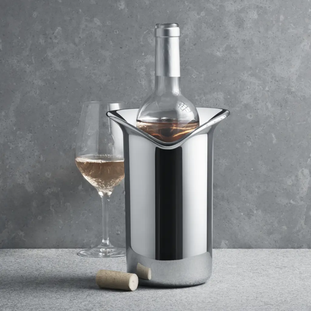This classic and timeless wine cooler allows wine lovers to celebrate their passion in a very refined way. The wine cooler was designed by Swedish architect Thomas Sandell, and it brings an element of style to any table and a bit of chill to your bottle. The wine cooler is carefully crafted from mirror polished stainless steel and once you touch it, your hands will instantly confirm what the eyes have seen. The double layered steel has an isolating effect and that helps the wine maintain its temperature longer. So do not expect a cooling function, rather a maintenance of temperature. A good bottle of wine deserves a companion like this.