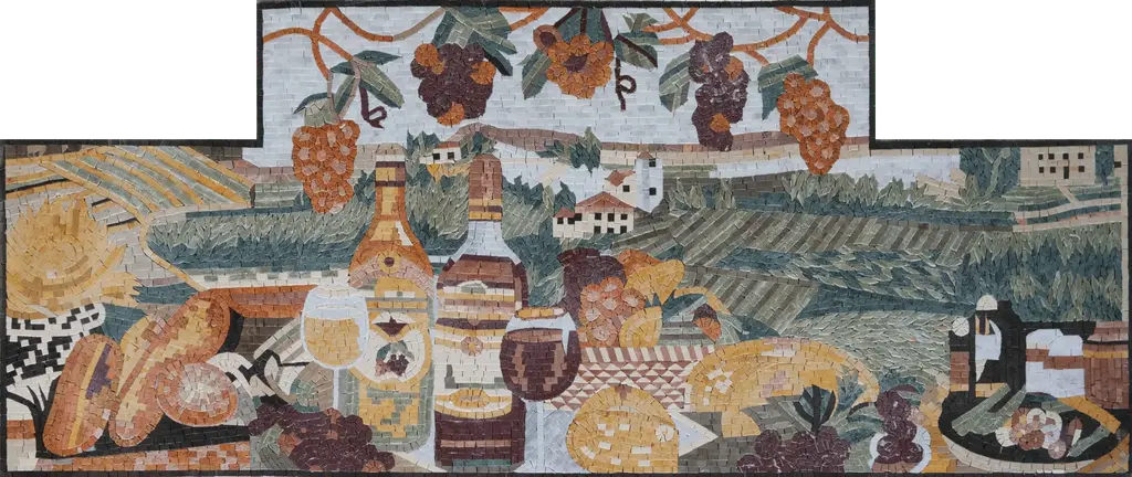 Discover the exquisite charm of our Wine and Cheese Mosaic Backsplash, where the iconic combination of wine, cheese, and bread comes to life in stunning detail. This beautiful backsplash serves as a delightful tribute to the essence of French cuisine, encapsulating the serene scene of a dreamy picnic in the countryside. With its soft pastel hues and the gentle flow of waving tall grass, this mosaic is designed to transport you to a blissful escape every time you step into your kitchen or dining area.Each piece of the Wine and Cheese Mosaic Backsplash is meticulously handcrafted from natural marble mosaic stones, ensuring that every tile is not only a work of art but also a testament to durability and quality. This makes it an ideal choice for high-traffic areas such as kitchens and dining spaces, where style meets functionality. The unique design allows the backsplash to serve as a focal point in your home while seamlessly complementing a variety of decor styles, from rustic to modern elegance.Installing the Wine and Cheese Mosaic Backsplash in your home isn't just about aesthetics; it's about creating an ambiance that celebrates the joys of gathering with loved ones over good food and drink. Imagine hosting family dinners or cozy gatherings with friends, where the backdrop of your space enhances the experience and inspires conversation. Elevate your home decor with this stunning Wine and Cheese Mosaic Backsplash and bring a piece of that joyous French culinary atmosphere into your life. Perfect for kitchens, dining rooms, or even as an accent wall, this backsplash will not only beautify your space but also evoke the feelings of warmth and hospitality that make any house a home. Choose the Wine and Cheese Mosaic Backsplash for a timeless addition that reflects your love for fine foods and exquisite design.