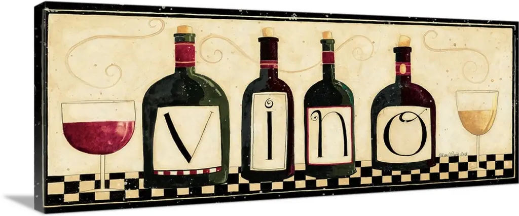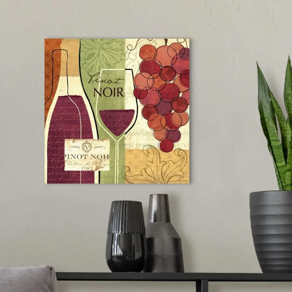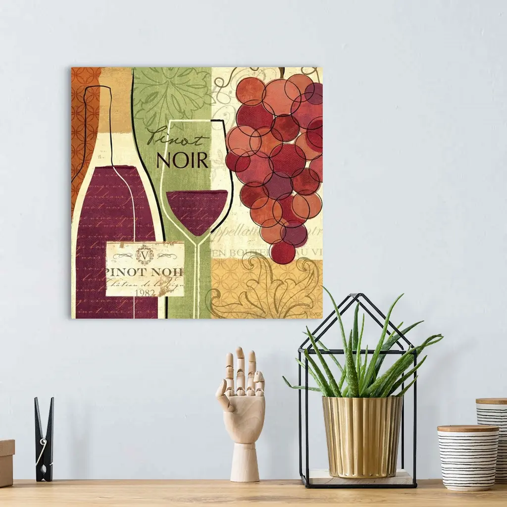 Docor perfect for the kitchen that has a bottle of pinot noir and a filled wine glass next to it with red grapes hanging on the very right side of the print.