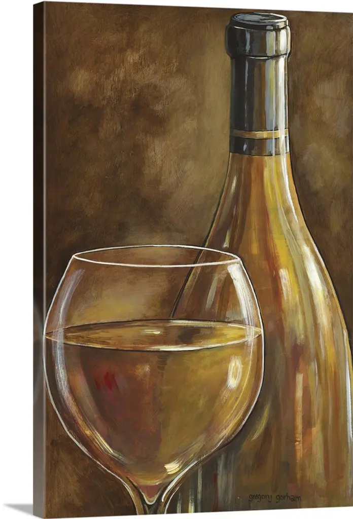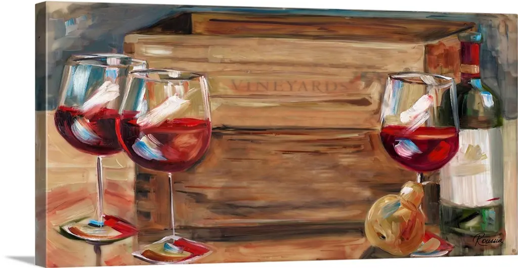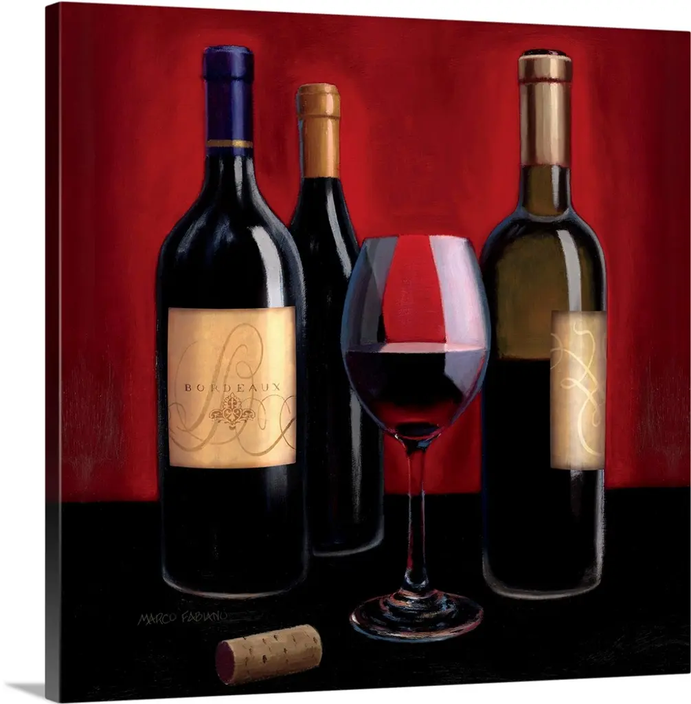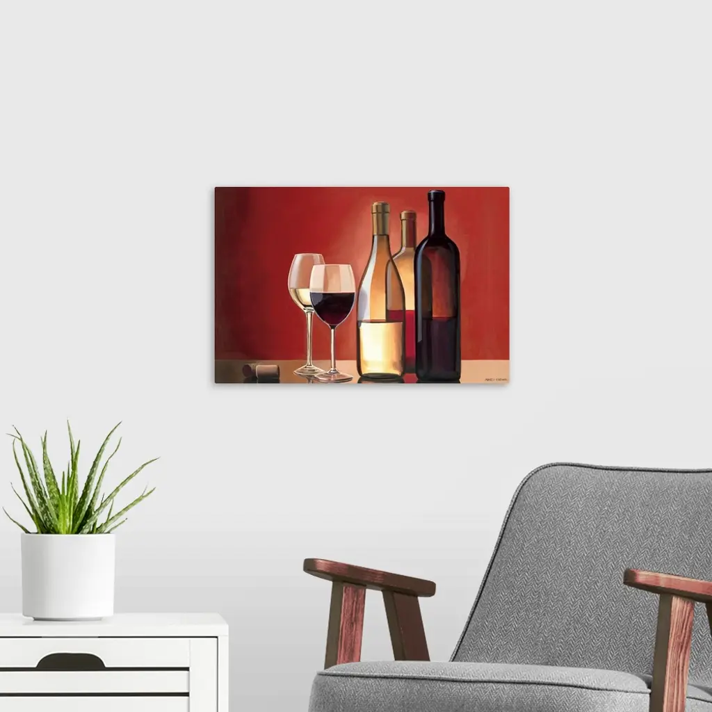 Two wine glasses, corks, and three bottles of wine, including white wine, red wine, and rose.