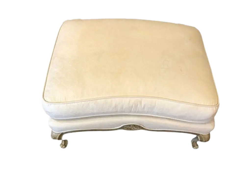 Wingback Pierre Deux Highland House Louis XV Style Designer Chairs set includes a square-shaped accent chairs. Two chairs with an ottoman with unnoticeable marks. All upholstered in a striped beige damask fabric. These antique chairs, manufactured in France in 1970, feature a Louis XV style with a beige painted finish.The is made of wood and fabric. The set exudes elegance and sophistication, perfect for a living room setting with a seating capacity of three. The brand, Pierre Deux, is known for its high-quality designer furniture pieces. 1st Chair: 36x34x41 2nd Chair: 36x27x30 Ottoman: 36x25x21