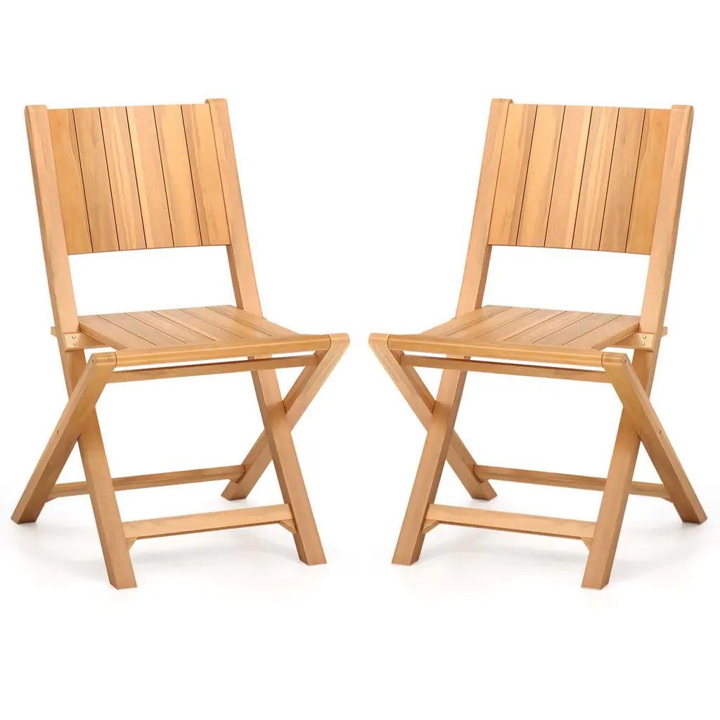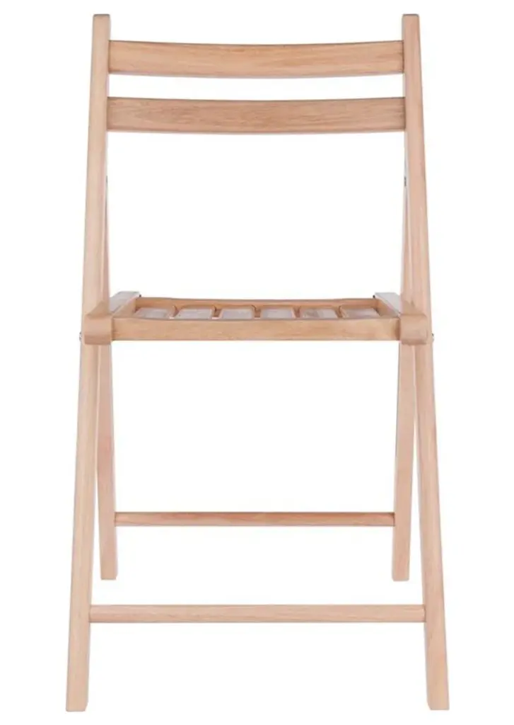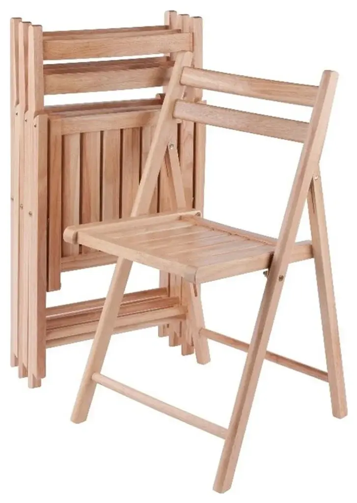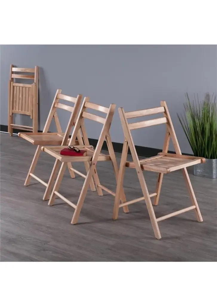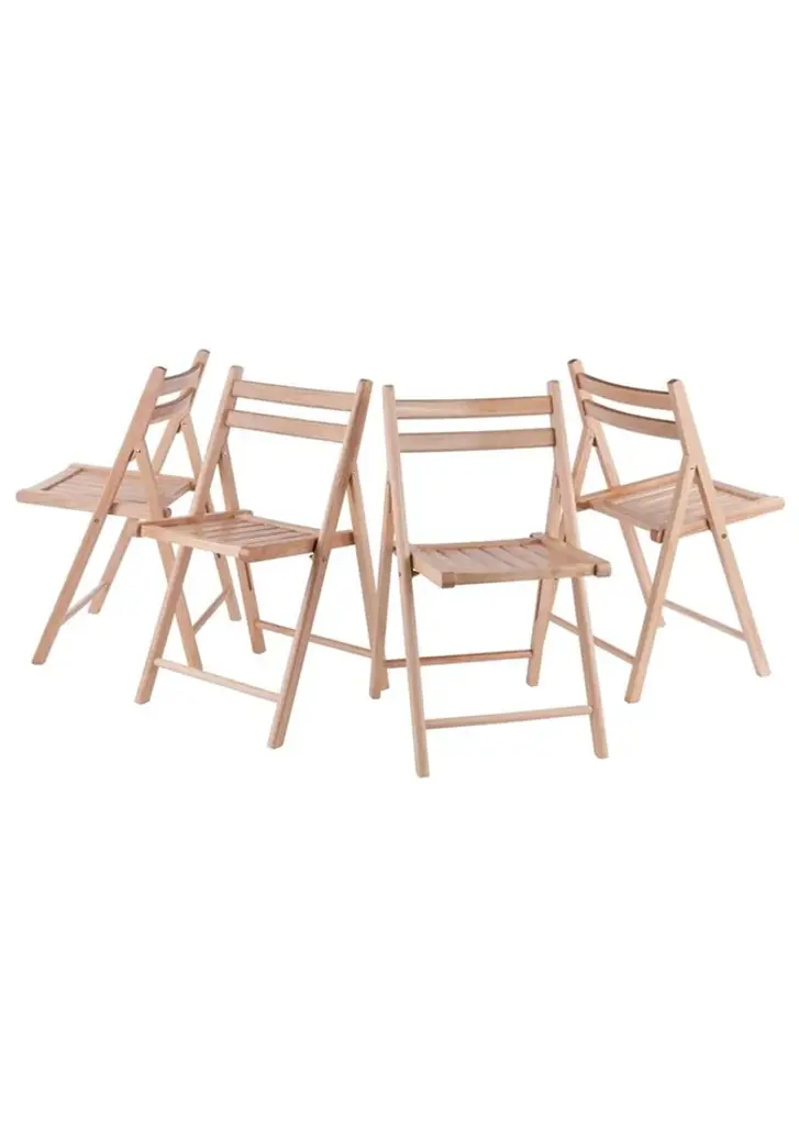 The Robin 4-PC set of solid wood folding chairs in natural finish has a traditional style with the contoured back and slatted seat for comfortable seating. Provide extra chairs for any room in your home and never be caught out of seating with these chairs. Easily folds away for storage.Features:Set includes: 4 piecesMaterial: Solid woodFinish: NaturalStyle: TransitionalSpecifications:Product Dimensions: 32.68"H x 17.64"W x 19.8"DProduct Weight: 35.27 lbsSeat Dimensions: 17.4"H x 15.1"W; (Seat Back) 14.9"H x 17.6"WWeight Capacity: 170 lbsProduct Dimensions: (Folded to) 35.1"H x 17.6"W x 2.8"DAssembly Required: Already Assembled