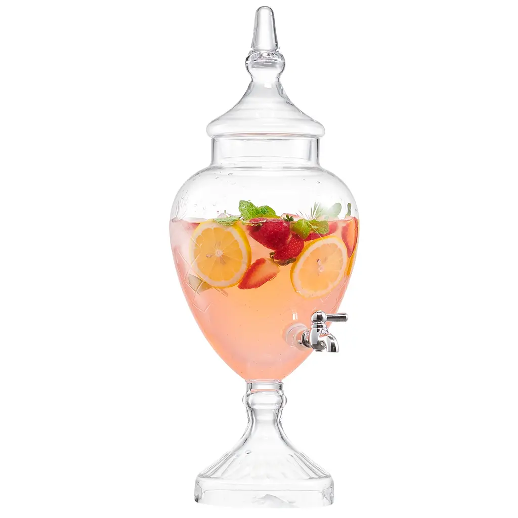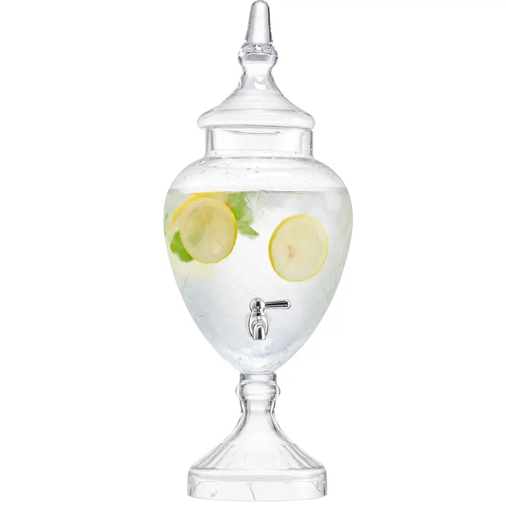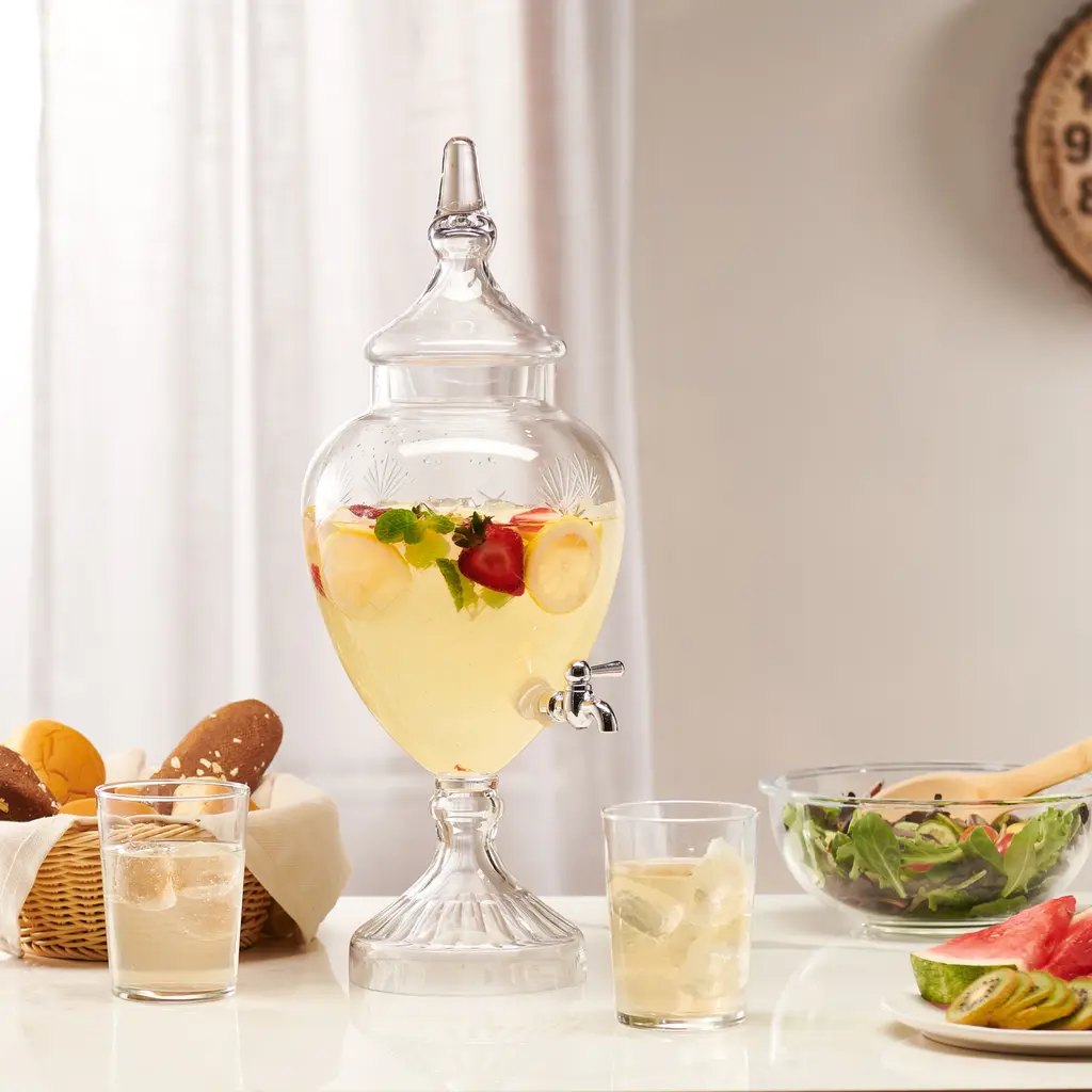 From sweet tea to freshly-squeezed lemonade and fruit punch, this 1 gallon Fifth Avenue Crystal Provence glass beverage dispenser makes serving eye-catching refreshments effortless! The sleek silver-colored spout on this non-insulated dispenser allows for easy dispensing so your patrons can conveniently serve themselves. Use this dispenser for your hotel breakfast bar, party, or event, and it's great for either casual or formal occasions. Made of durable glass with stylish etched detailing around the bottom of the container, this timeless piece is perfect for showcasing your colorful beverages. Simply lift the handle on the decorative, tiered lid to refill drinks or add sliced fruit for an infusion of flavors. Use this beautiful piece to enhance the look of your beverage service and serve your popular beverages in style!