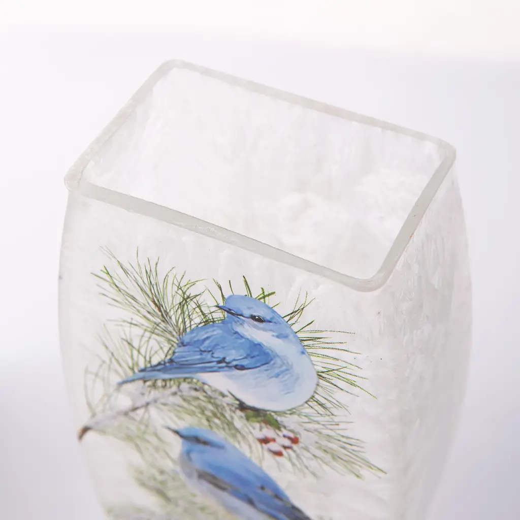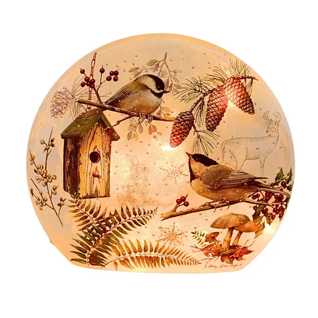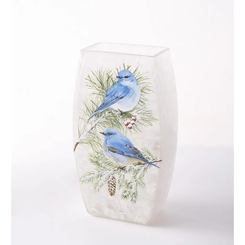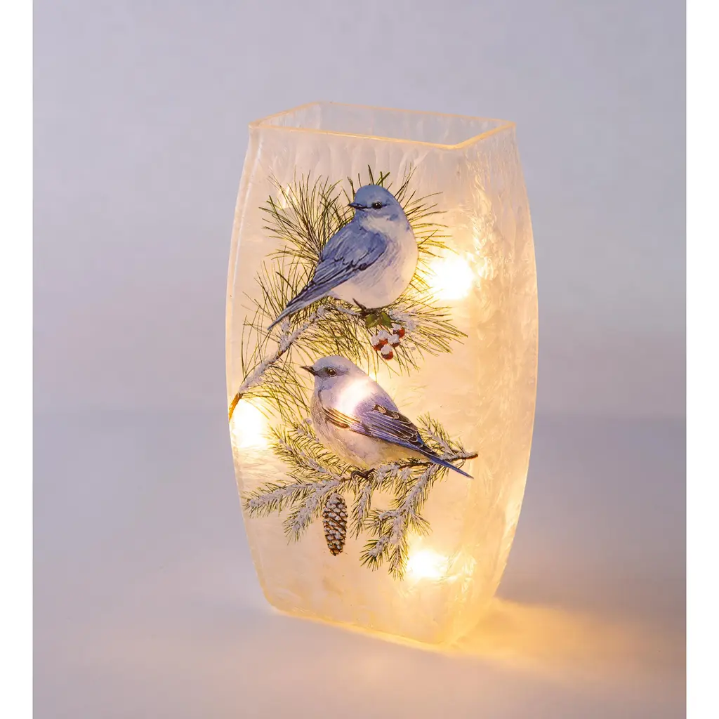 Add instant ambiance to any room with our elegant Winter Bluebirds Frosted Glass Accent Light. Two beautiful bluebirds sit on snowy branches, illuminated from within by a string of 8 warm white LED lights. The light string is adorned with faux winter greenery, softening the glow of the lights for a more subtle display. The design is a decal enhanced with glitter and hand-painted accents. You'll love this on a table, mantle or shelf. Great gift for bird lovers, too! Easy, battery-operated light has a timer for 6 hours on, 18 hours off, or simply use the on/off switch. Takes 2 AA batteries, not included.