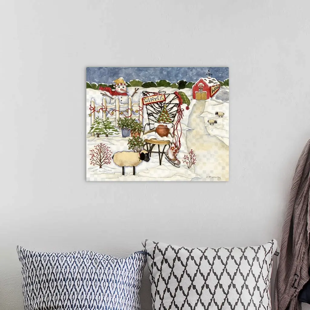 Barn with path leading to fence with snowman, sheep, tiny trees, and a chair with a hat and a sign that reads: winter.
