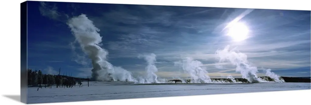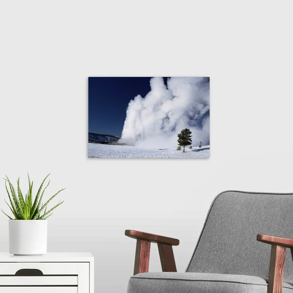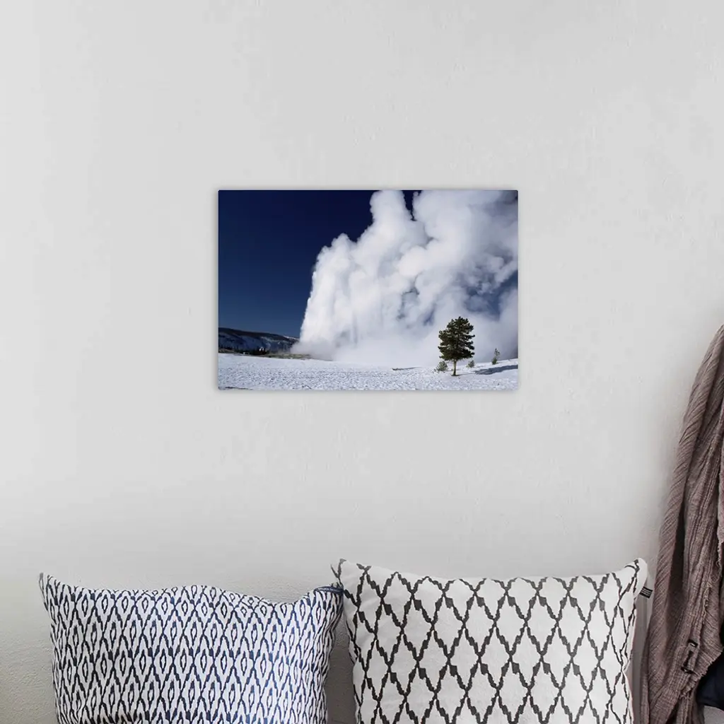 Winter eruption, Old Faithful geyser, Yellowstone National Park, Wyoming, USA wall art for home and office decor. Discover canvas art prints, photos, mural, big canvas art and framed wall art in GreatBigCanvas.com's varied collections.