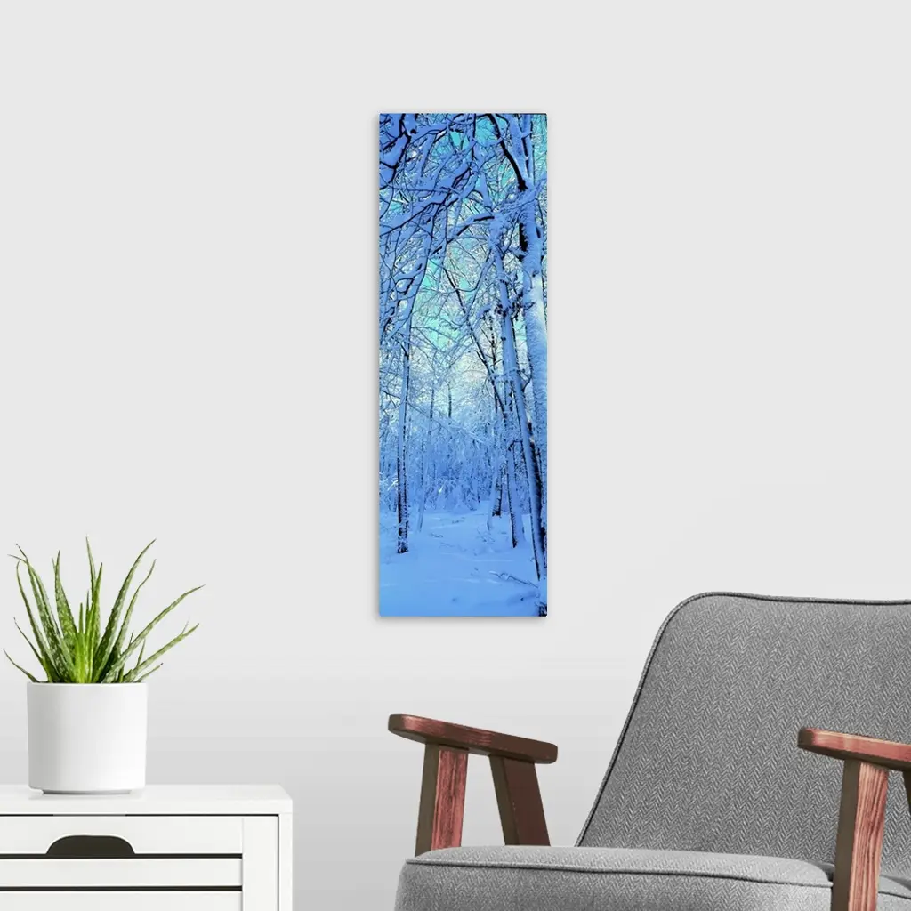 Tall and narrow photo on canvas of a forest with snow covered trees.