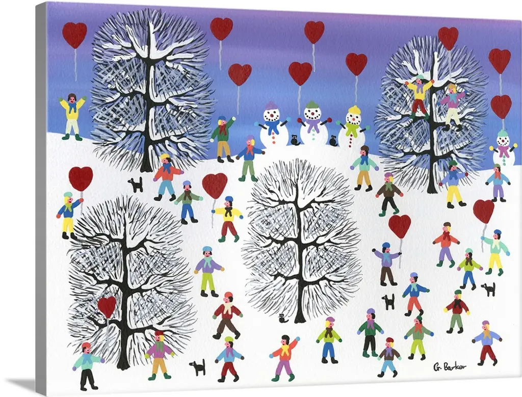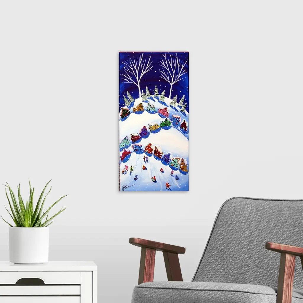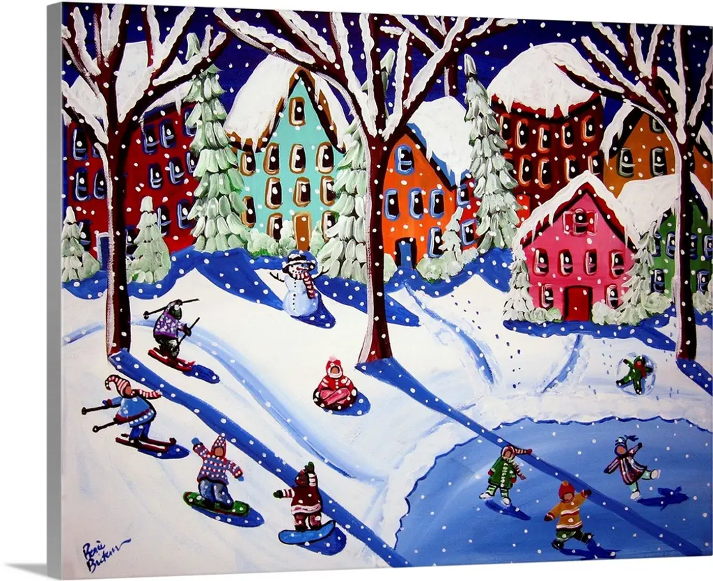 Winter scene with colorful houses and sled riders.