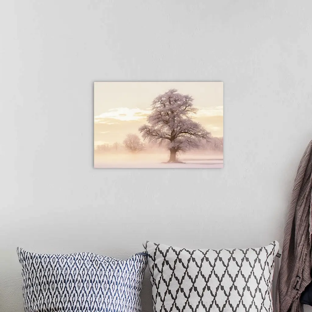 Large photograph of a foggy Winter landscape with snow covered trees and warm light from the sunrise.