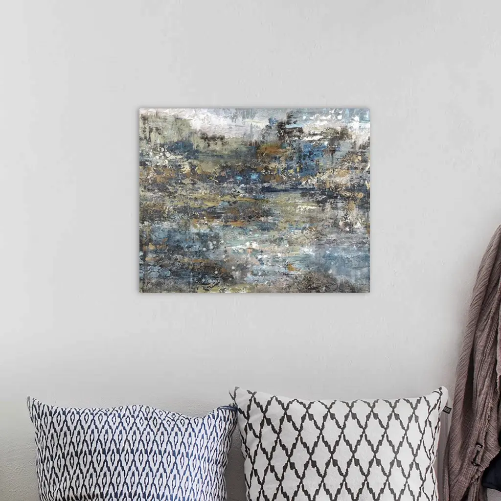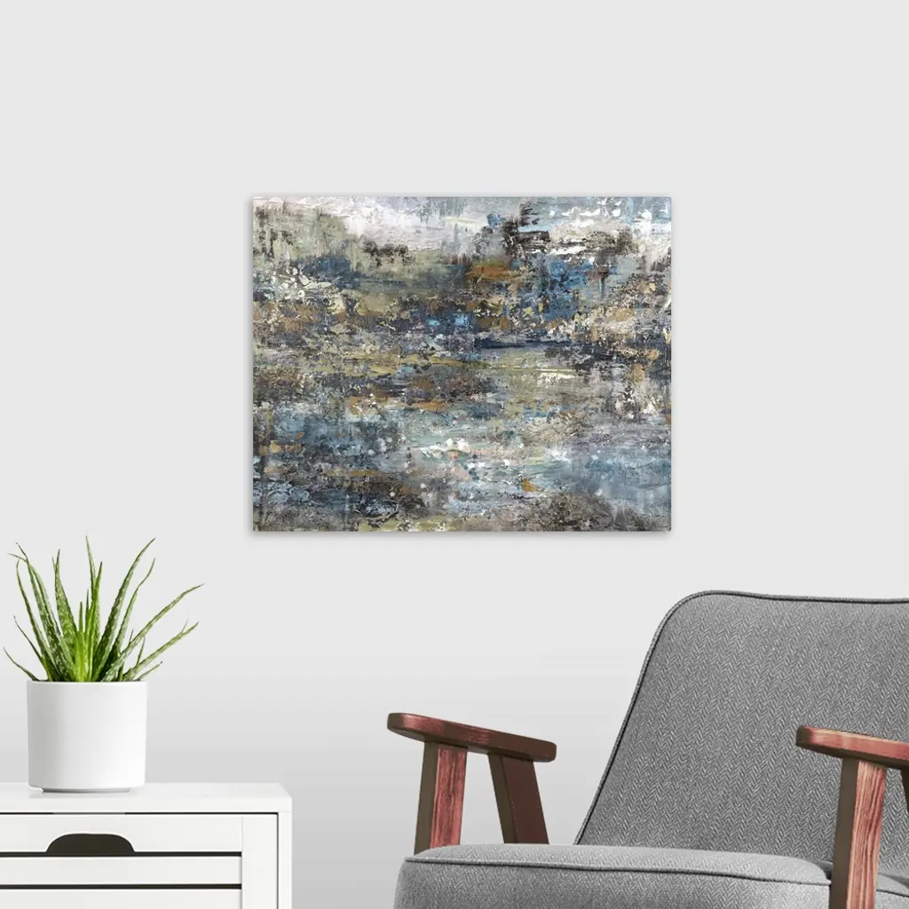 Rough textured abstract art with shades of blue, brown, gold, and white.