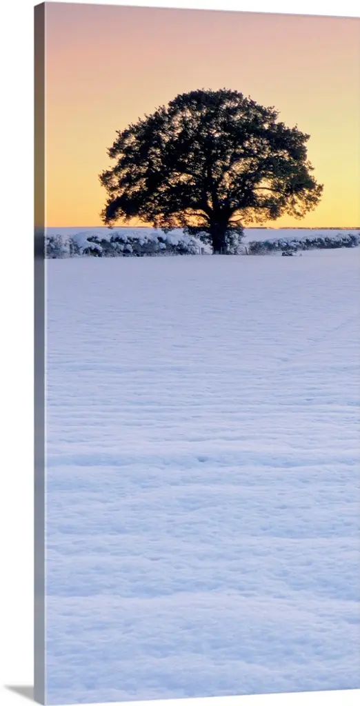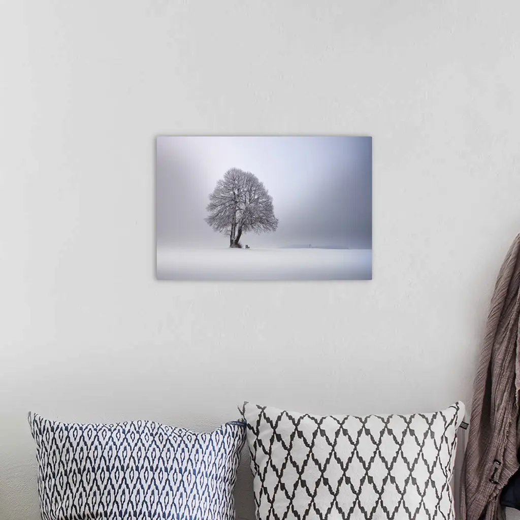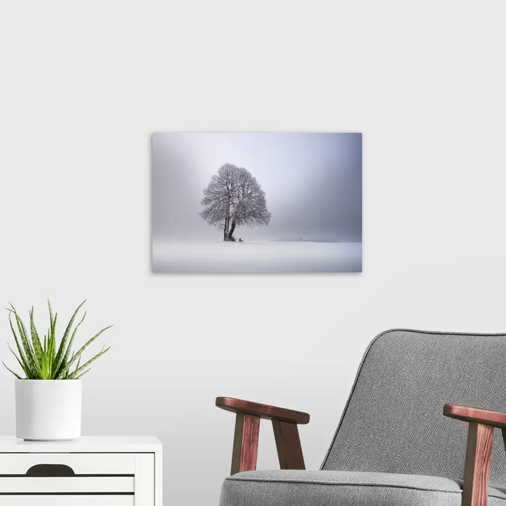 A lone tree in a snow-covered landscape wit ha small bench, Germany.