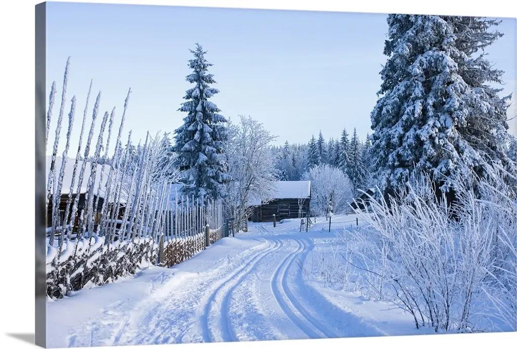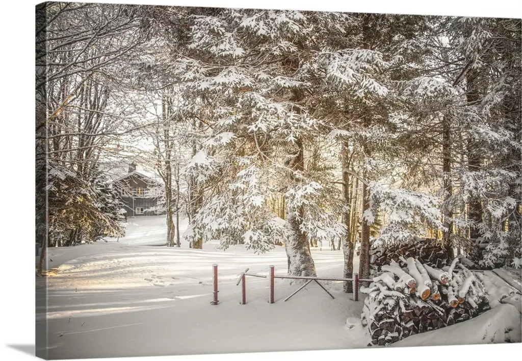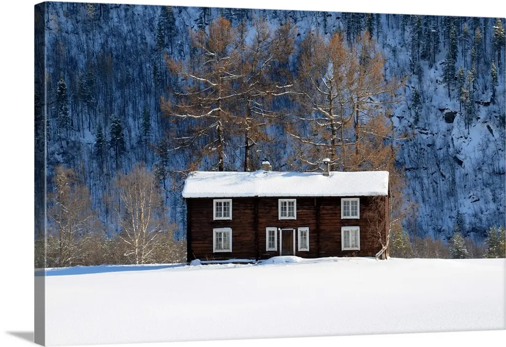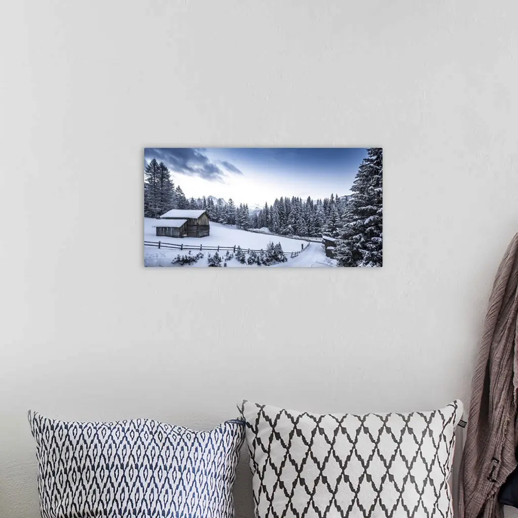 Winter Scene Looking Down At A Log Cabin Surrounded By Snow Covered Pine Trees, Italy