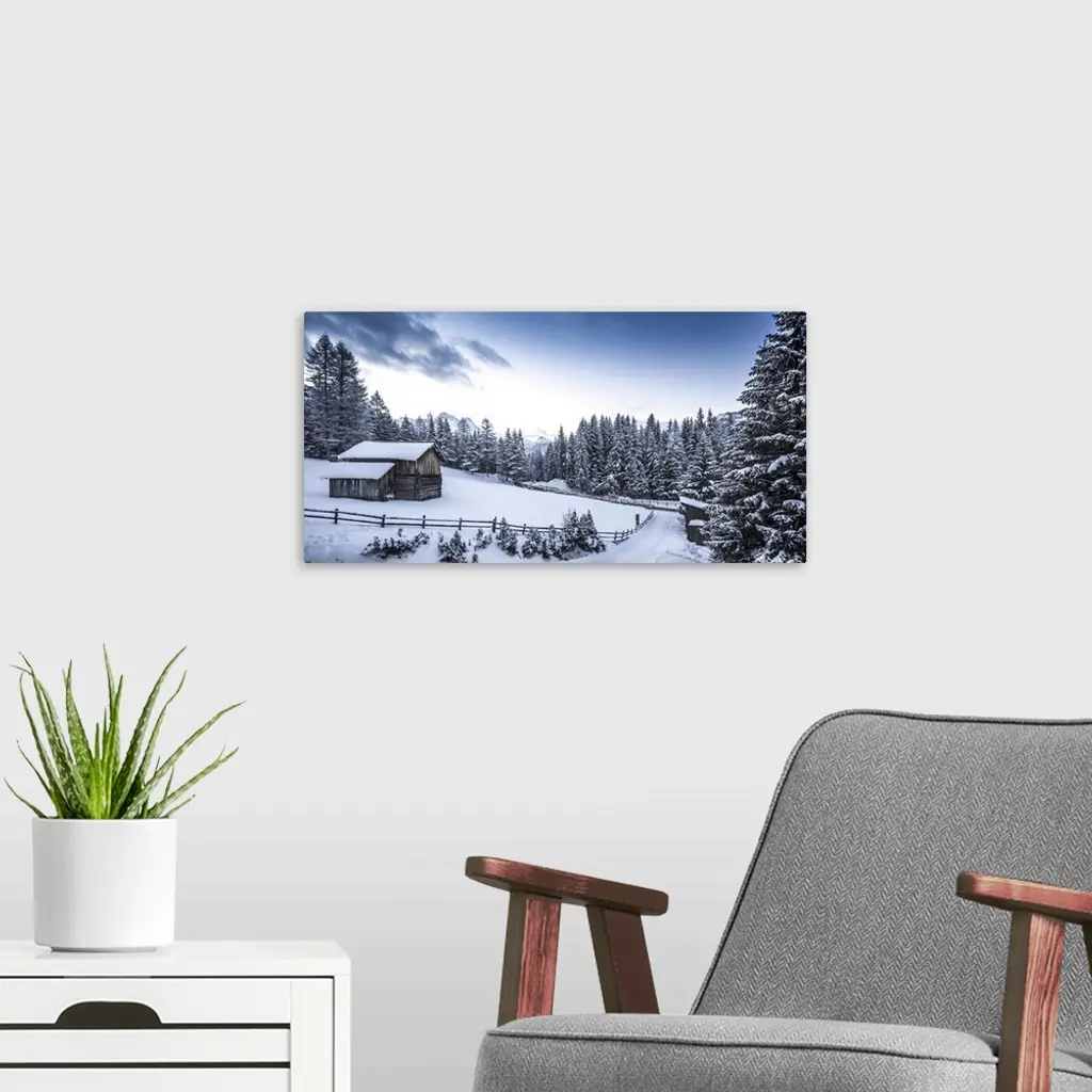 Winter scene looking down a country road at a log cabin surrounded by snow covered pine trees in Val Badia at the foot of the Dolomites in the Alto Adige Region, San Cassiano, South Tyrol, Italy