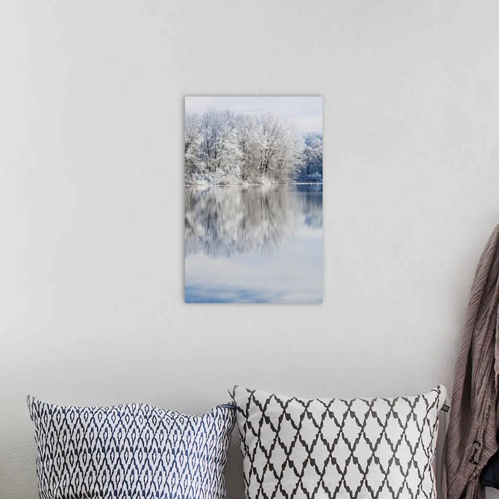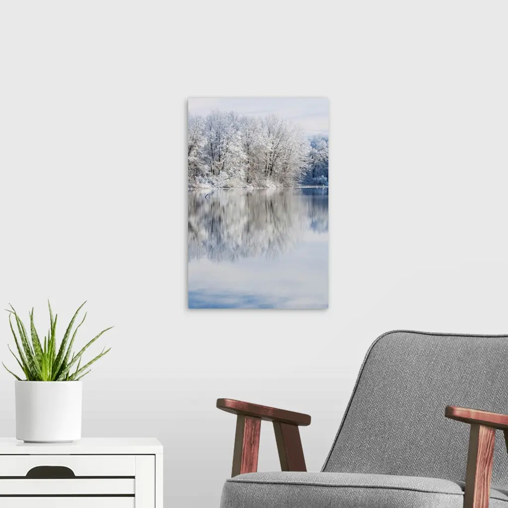 Winter landscape of snow covered trees on the shoreline of Jackson Hole Lake with reflections in calm water, Fort Custer State Park, Michigan, USA.