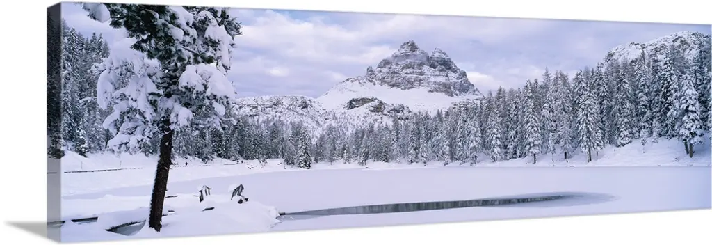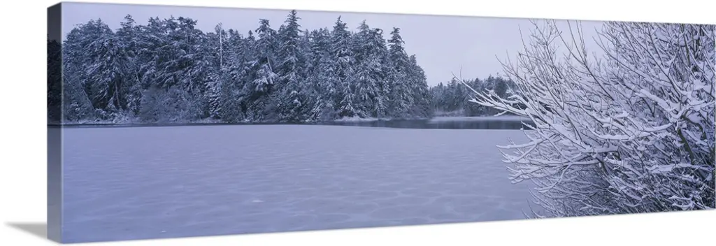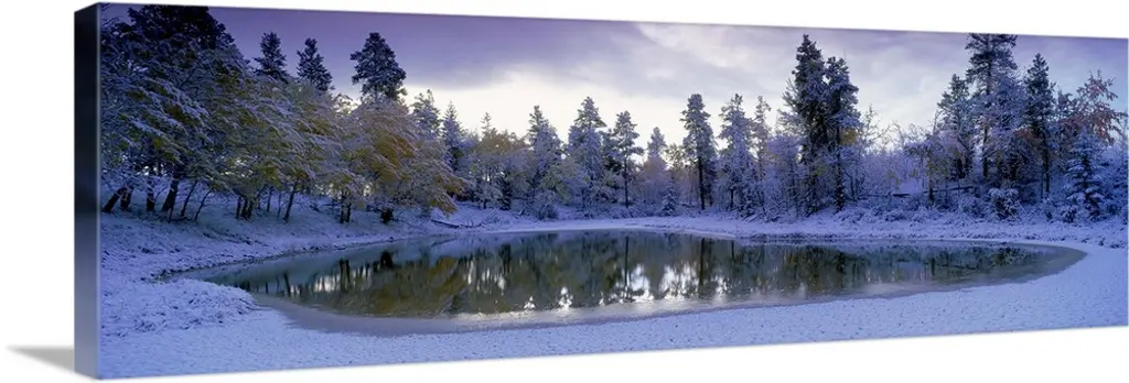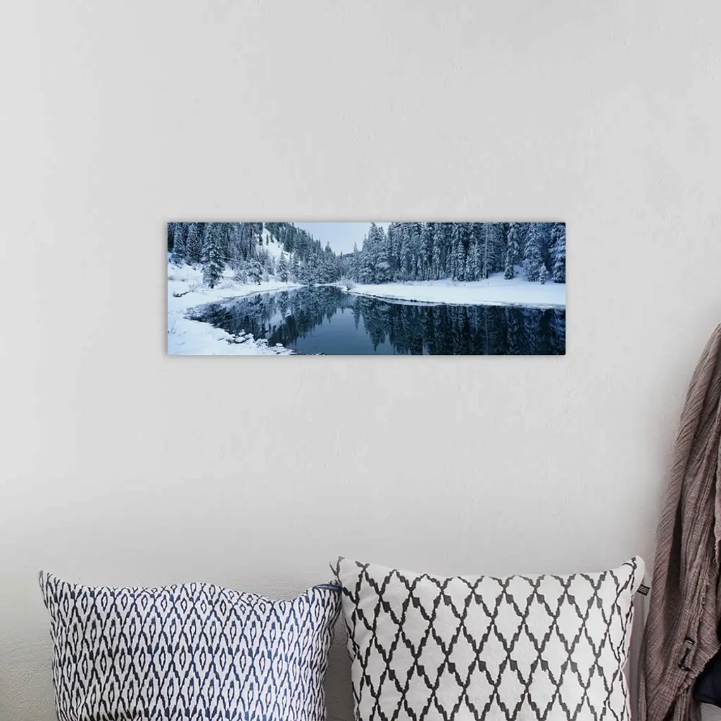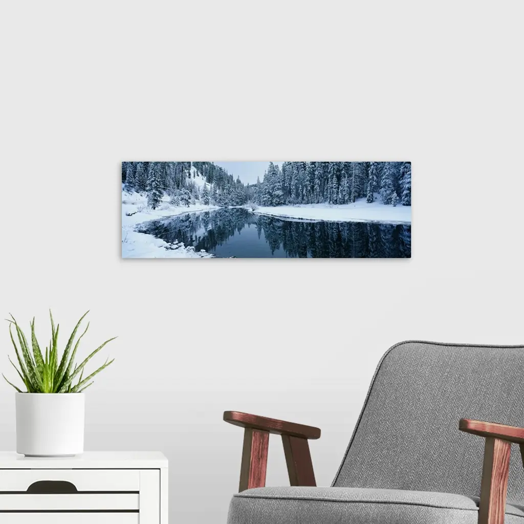 Wide angle photograph taken of a stream during winter with snow covered ground and pine trees lining the sides.