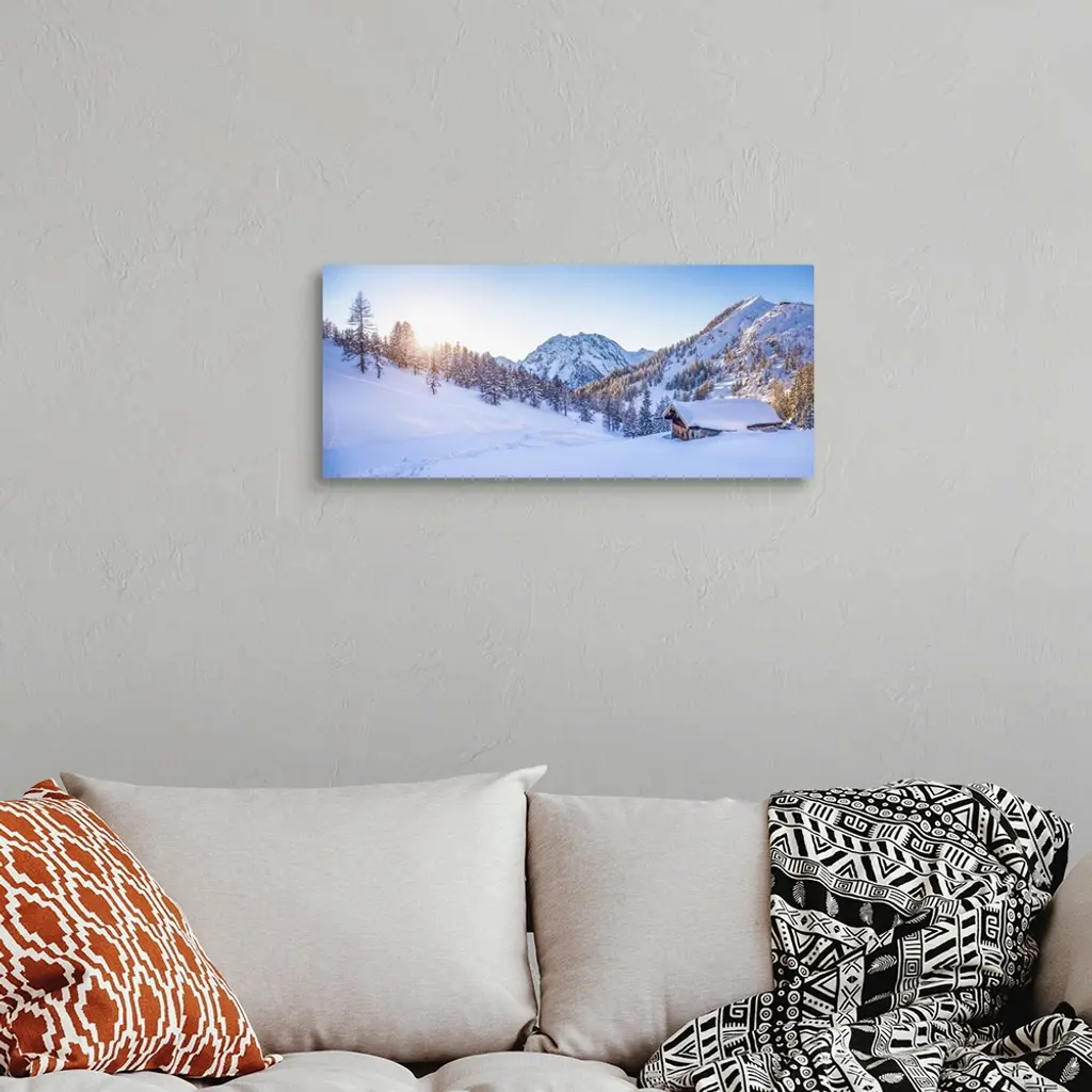 Panoramic view of beautiful winter wonderland mountain scenery with traditional mountain cabin in the Alps in golden evening light at sunset.