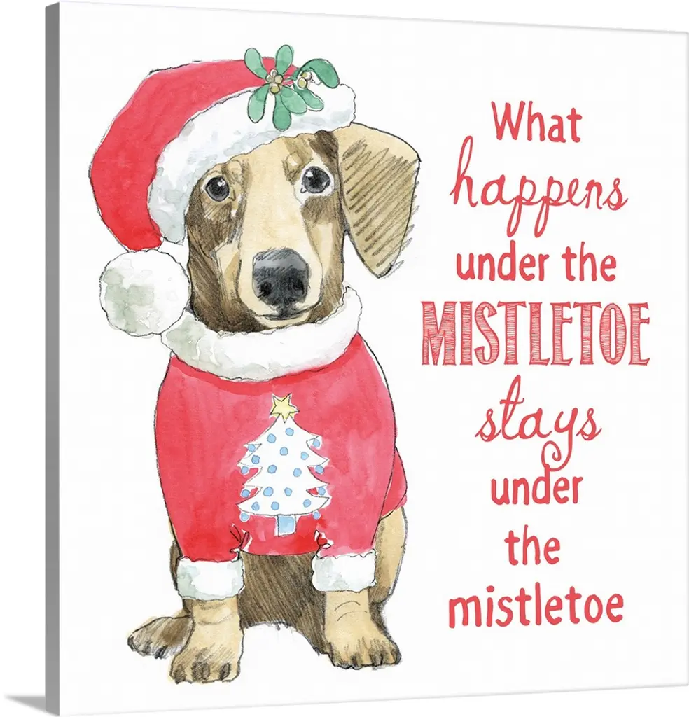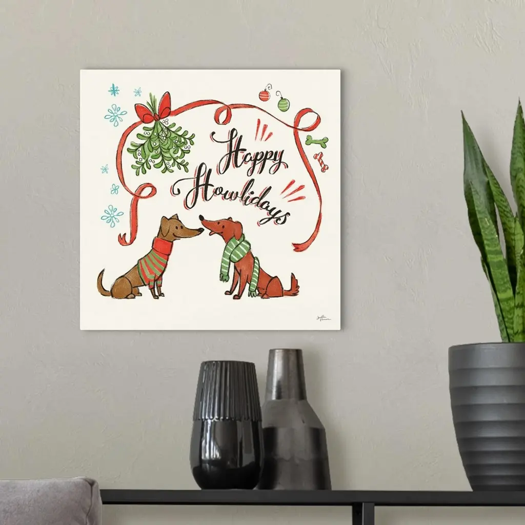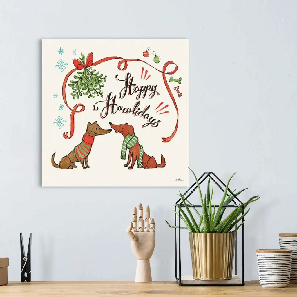 "Happy Howlidays" with a decorative holiday design of two dogs under a mistletoe.