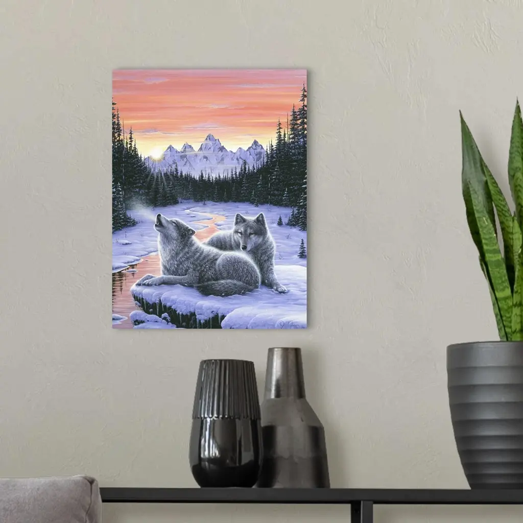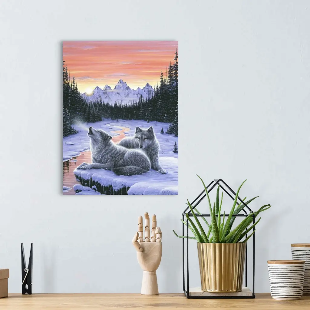 a pair of wolves lying on a snow covered rock over looking a stream with snow covered pines and mtns in the background