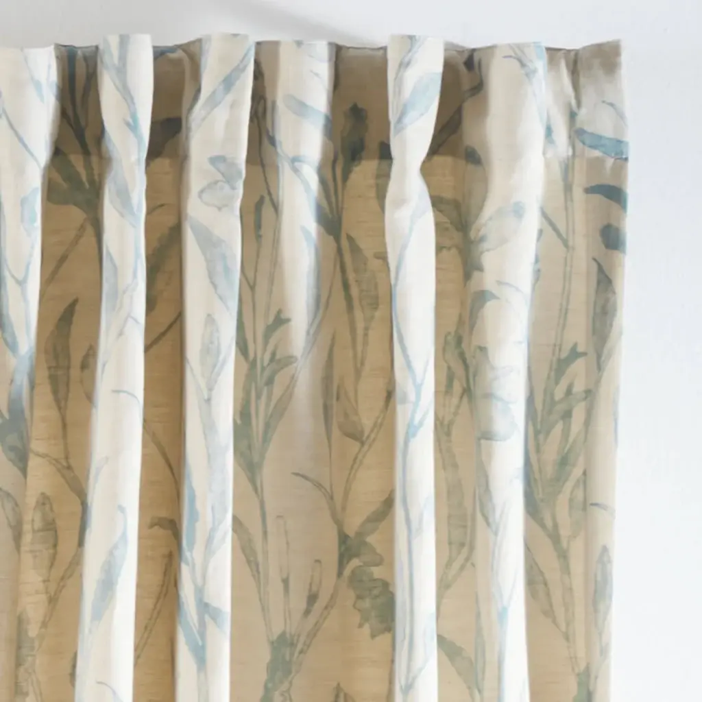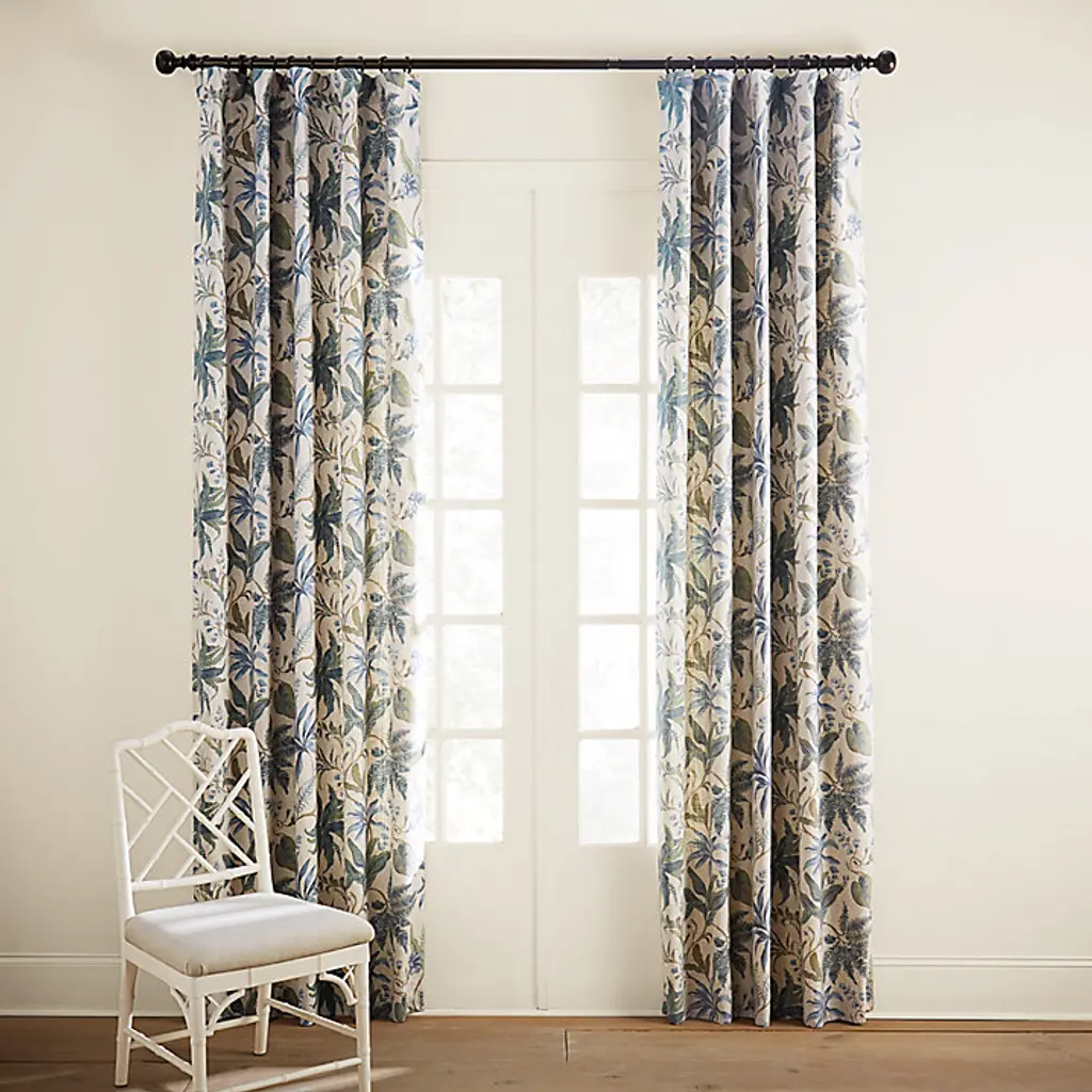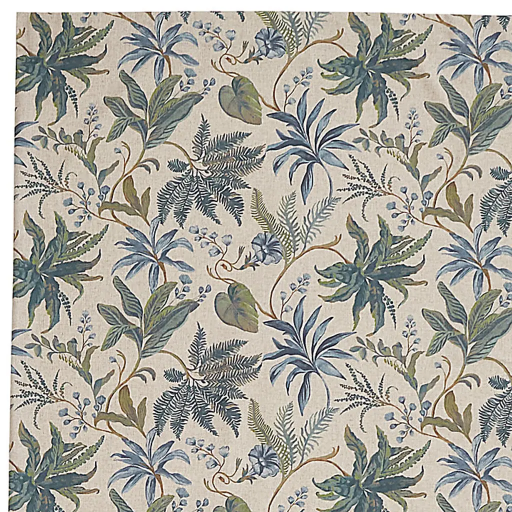 Soft blues and leafy greens give our pretty Winthrop Drapery Panel a fresh, updated look that feels just right for today. The floral motif of lacy ferns, trailing morning glories, and graceful branches is printed on natural poly-linen blend with plenty of open ground for easy mixing with lots of our favorite patterns and colors. Winthrop Drapery Panel features: