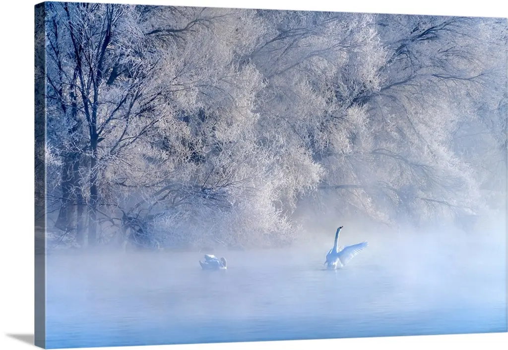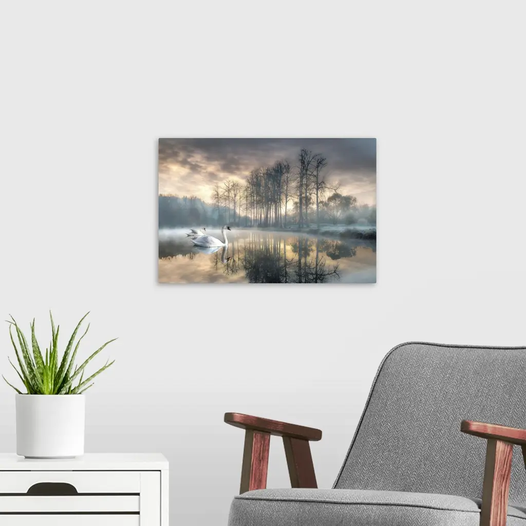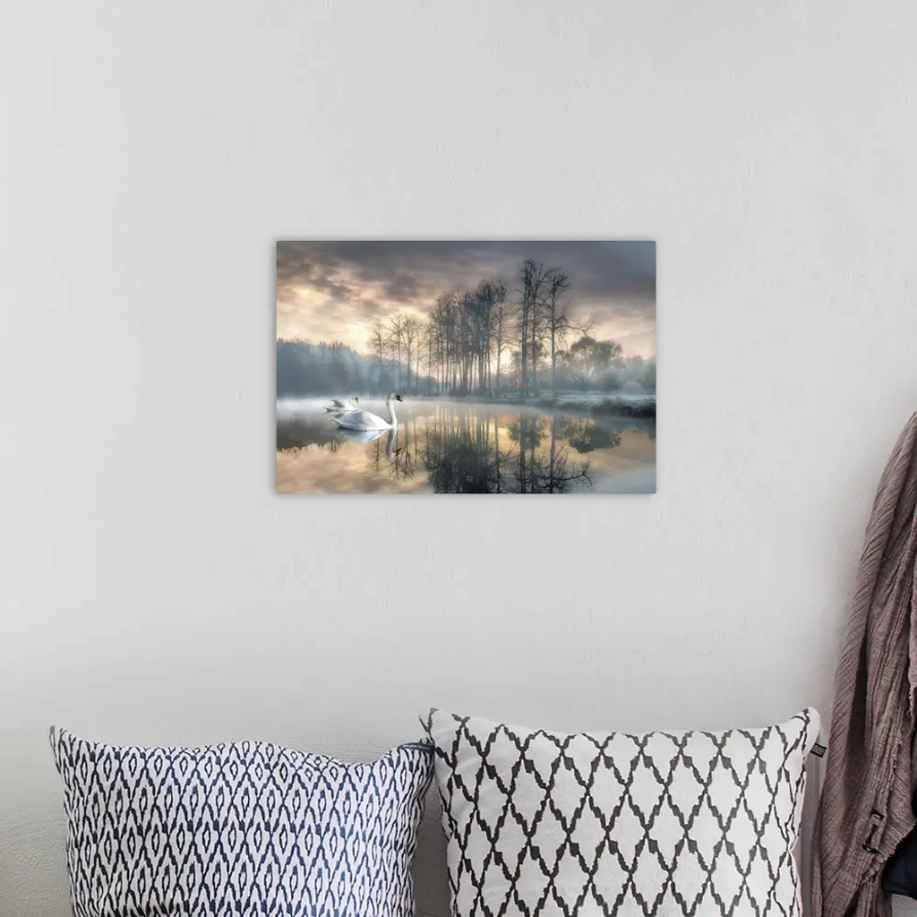 A watercolor rendition of two peaceful looking swans gliding over a frosty looking, mystic, misty forest pond softly lit by the early morning sunrise.