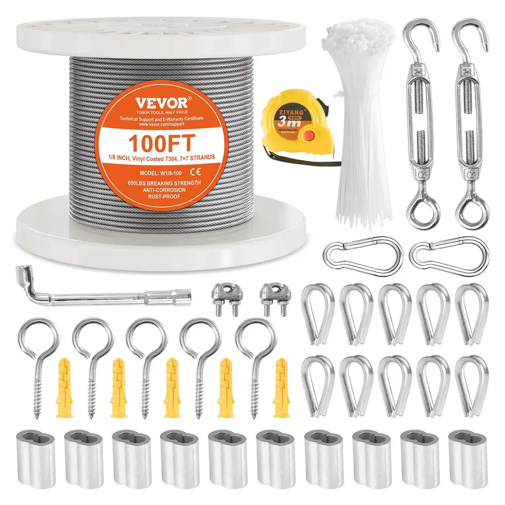 Rust and Corrosion Resistance: Our 1000 ft (305 m) steel cable is made of premium T316 stainless steel with added molybdenum that comes with a better performance on its breaking strength and anti-oxidation. It is great for outdoor installation that requires a tough quality and longer lifespan. Sturdy and Flexible: 1/8" (3.18 mm) stainless steel cable that builds upon the 7x7 braided construction. By comparing to other core designs, 7x7 balances both cable flexibility and its bearing strength. The steel cable works well for bending or folding when decorating your garden fence. Built Tough to Last: The breaking strength for our stainless steel wire rope is 1600 lbs (7.1KN). It is built to handle tough deck railing projects, and the polished surface makes installation safer and easier. Wide Application: The steel wire cable can be used for home garden fence cable installation, handrail strings, clotheslines, and industrial purposes, including packing, towing, and decking cable installations. Easy to Cut and Use: Our aircraft cable comes with a sharp steel blade cable cutter, slicing through with ease and leaving no burrs. And don't forget the gloves - keep your hands safe while you get creative! Package Content 1 x Steel Cable 1 x Cable Cutter 1 x Pair of Gloves 1 x User Manual