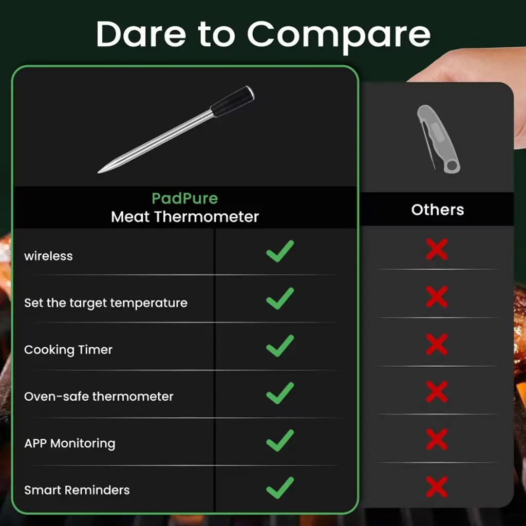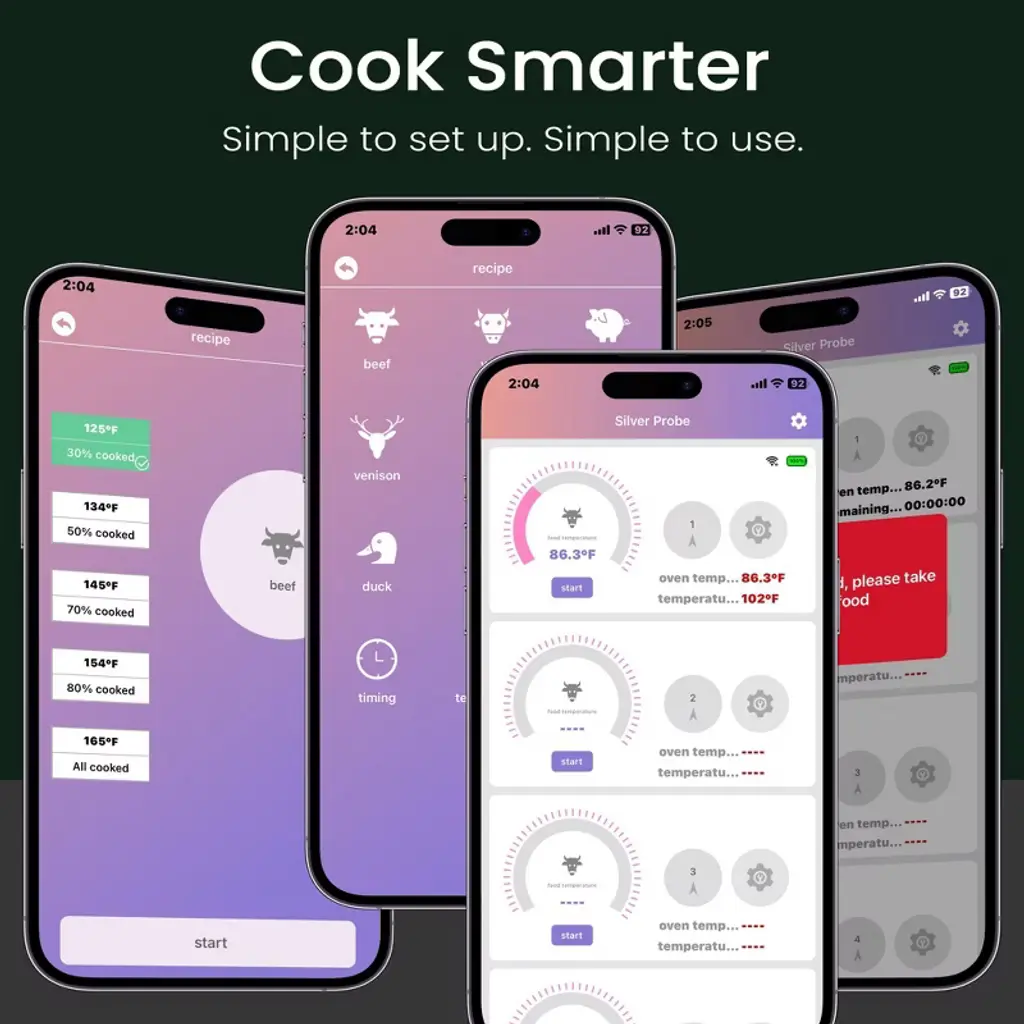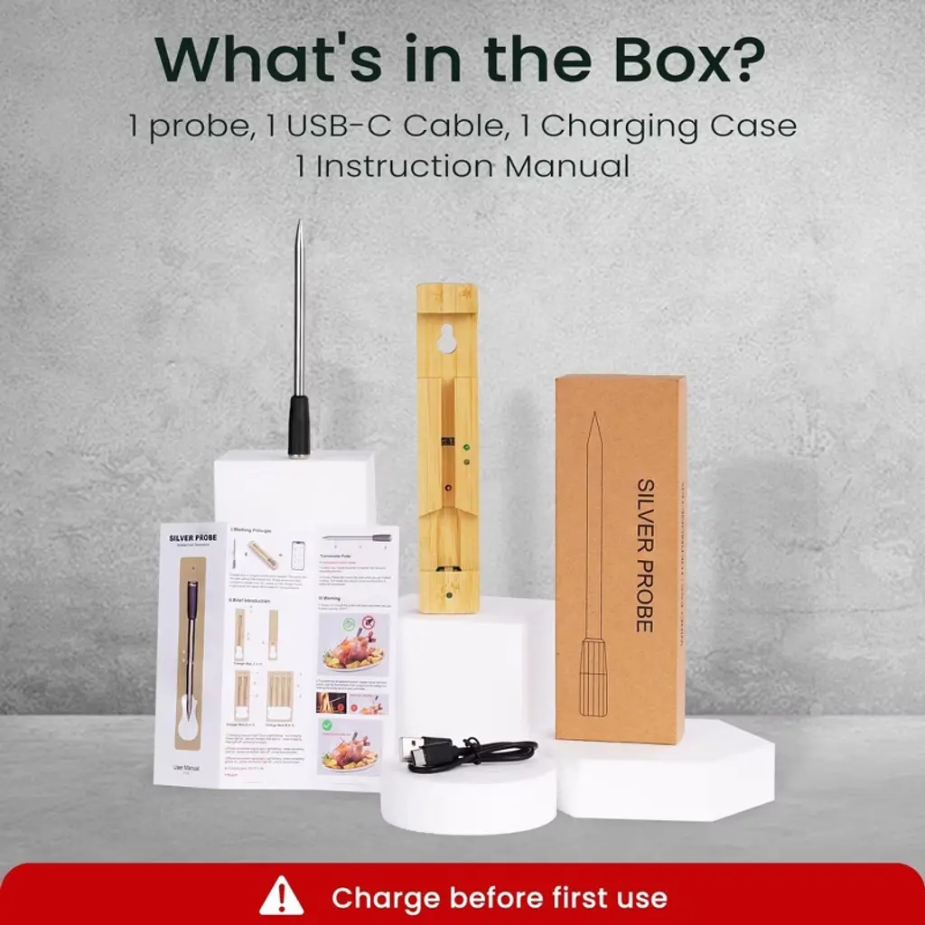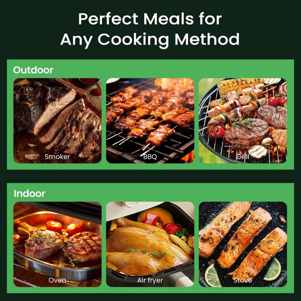 Cook meat to perfection with this 100% wireless smart thermometer featuring dual temperature sensors, app control, and a bamboo charging block that extends range and keeps your probe ready to go.