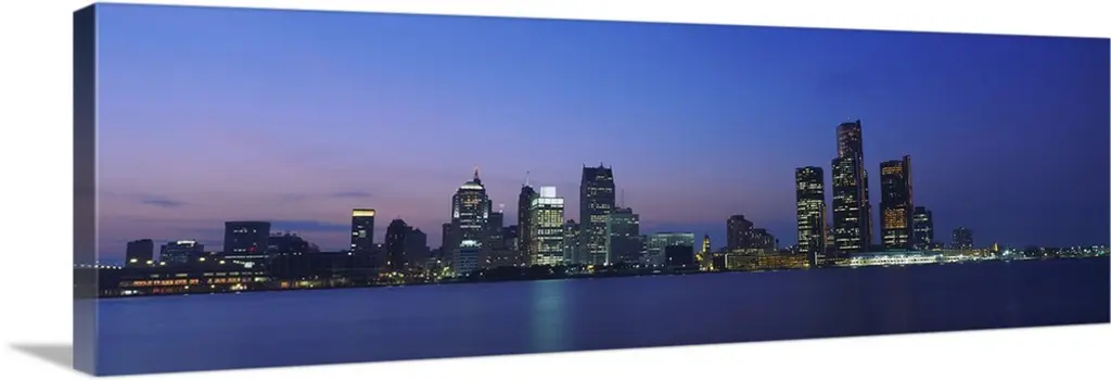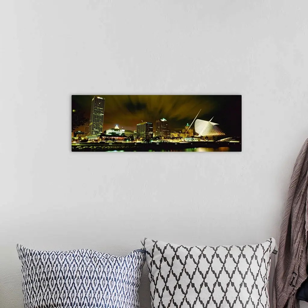 Wide angle photograph from water level of skyline lit up on panoramic wall art.