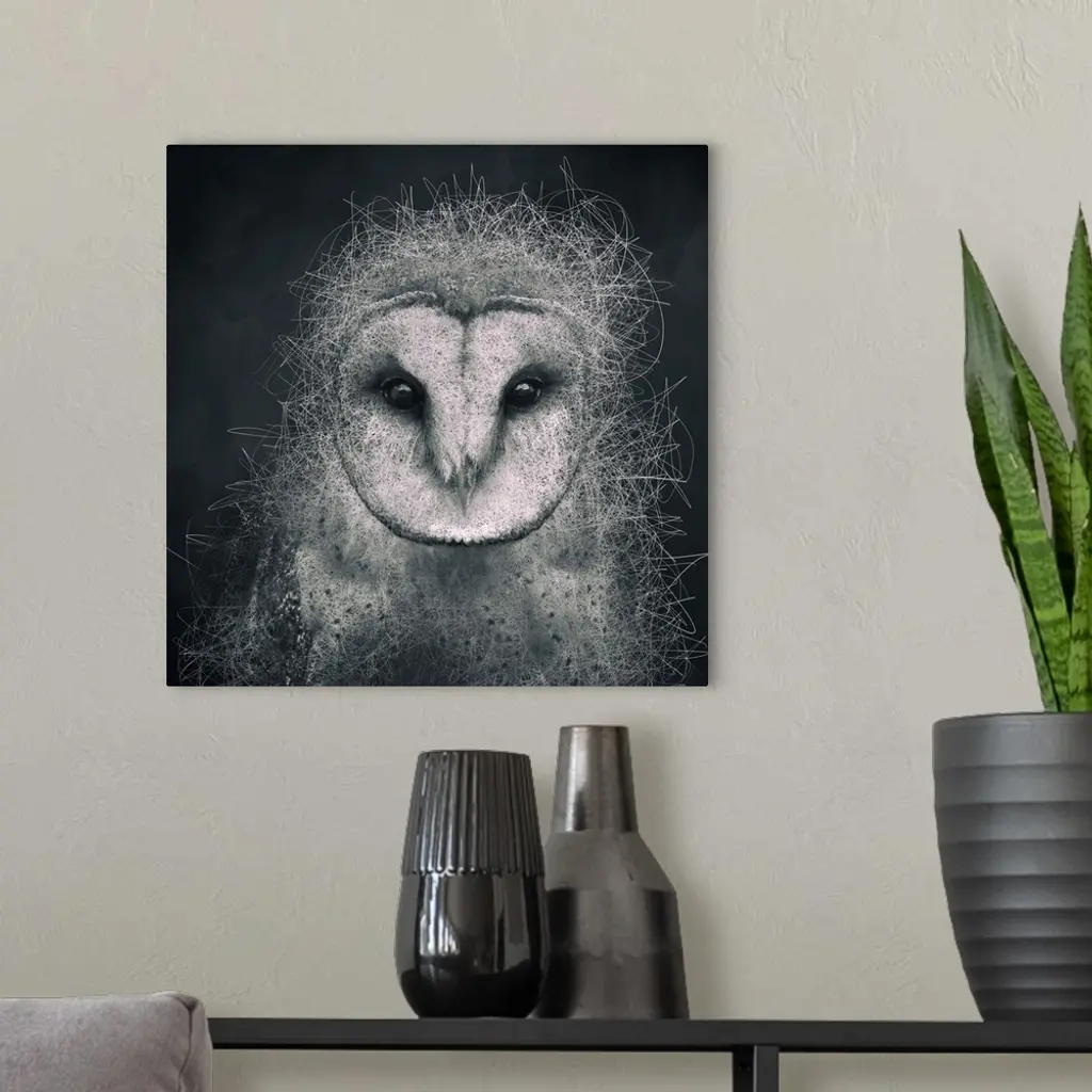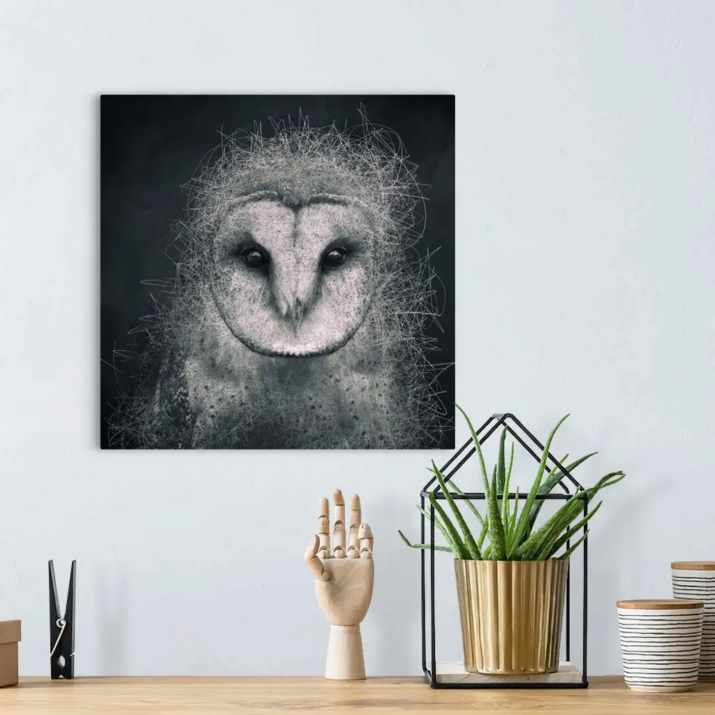 Abstract depiction of an owl with lines, texture, black, white and grey.