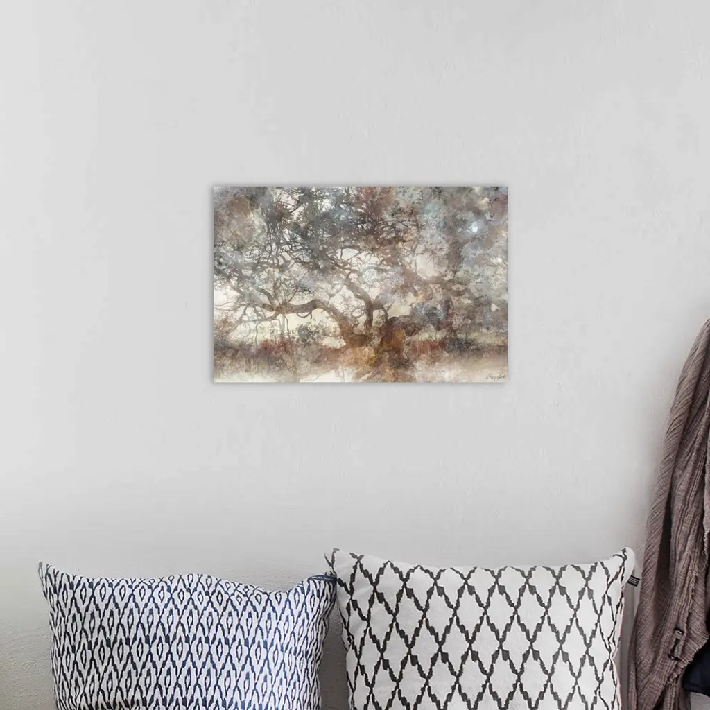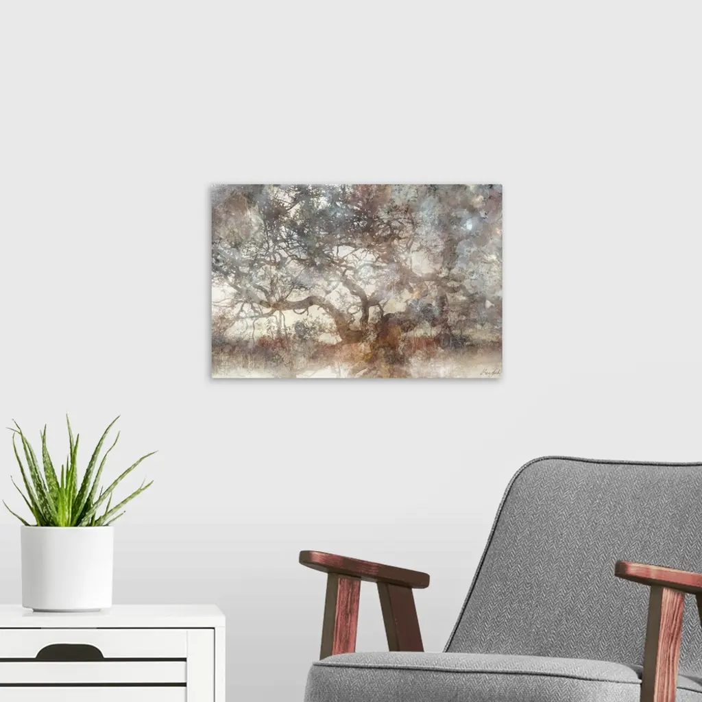 A graphic interpretation of an old, twisted tree in a misty, ethereal style. The neutral tones make it a perfect match for most color schemes, and it's soft contemporary feel make it perfect for living room, bedroom or dining room alike.