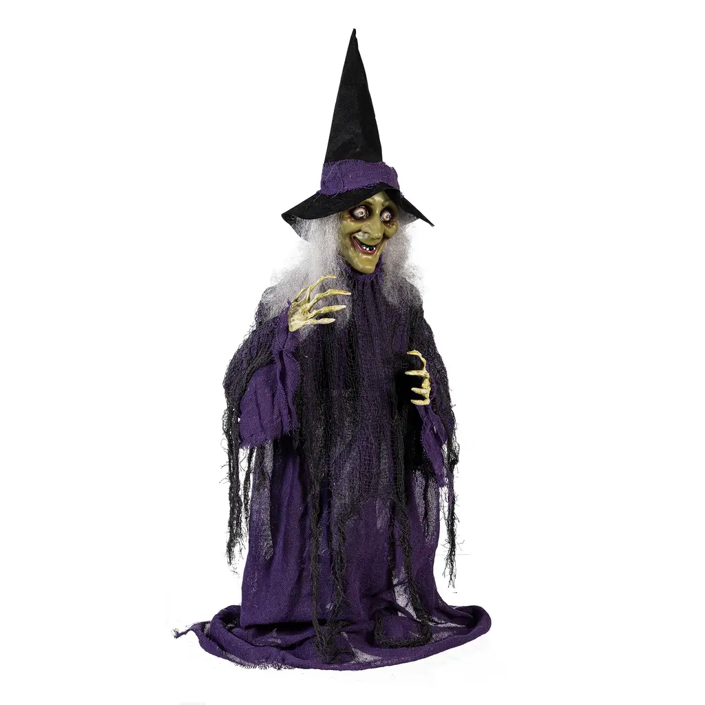 Add a green touch to the home with this spooky witch table decor. This piece features an eerie, motion-activated witch that moves and makes noise. Crafted with attention to detail, this piece is sure to catch everyones eye. Whether displayed on a tabletop, shelf, or mantel, this witch will be the talk of the party. It makes a great gift for anyone looking to decorate their home for Halloween. Requires 2 AA batteries, not included.