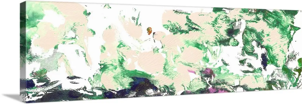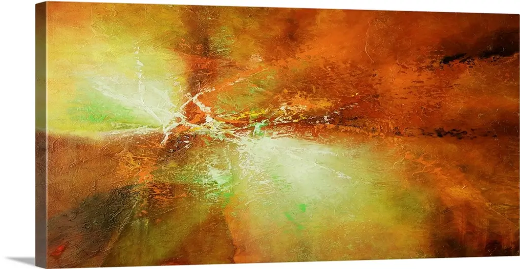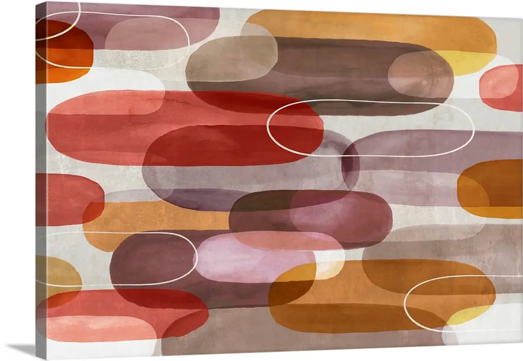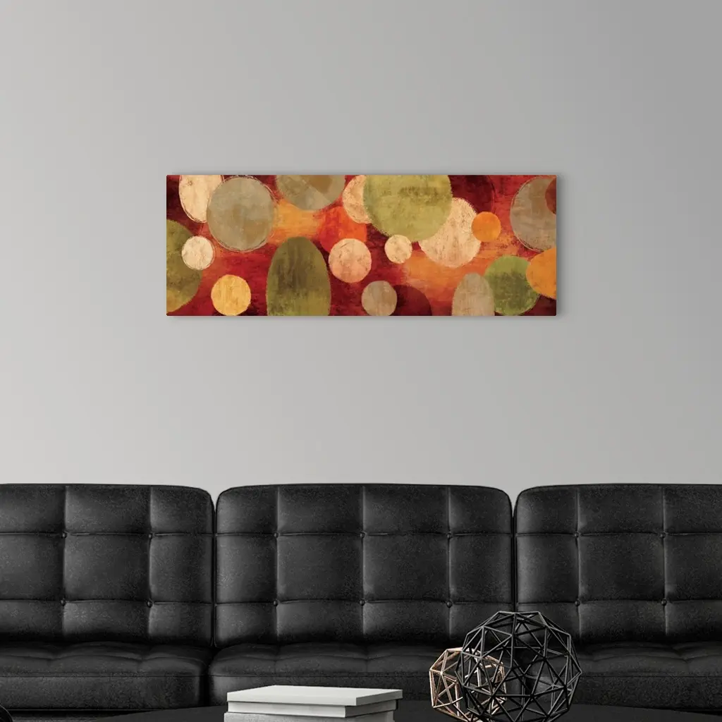 Panoramic abstract art with colorful circular shapes in hues of green, cream, yellow, gray, and orange on a red and yellow background.
