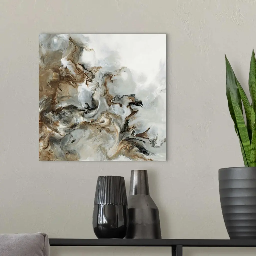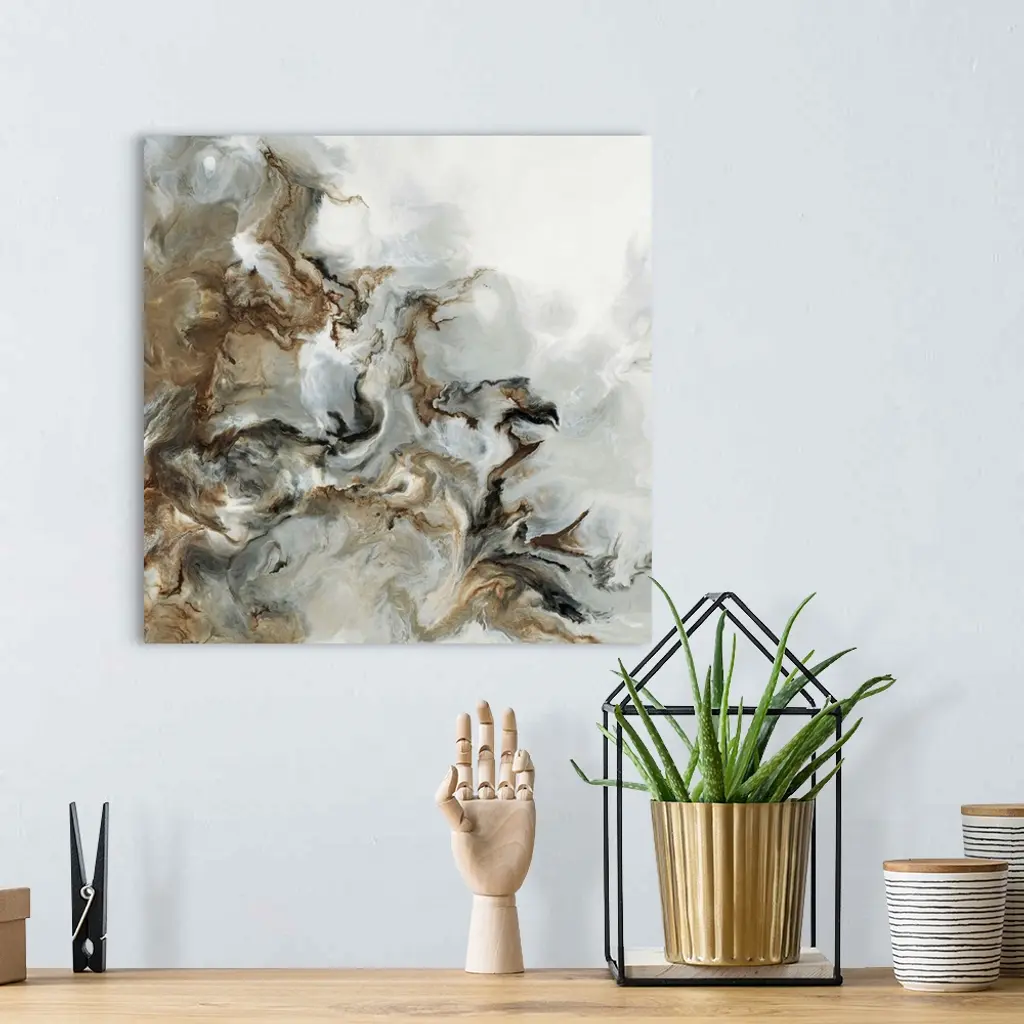 Abstract art with brown, black, gray, and white hues marbled together on a square background.