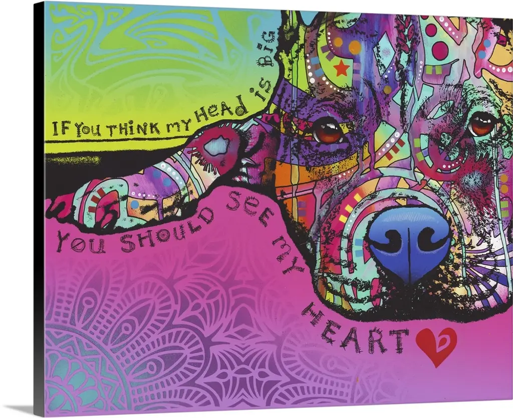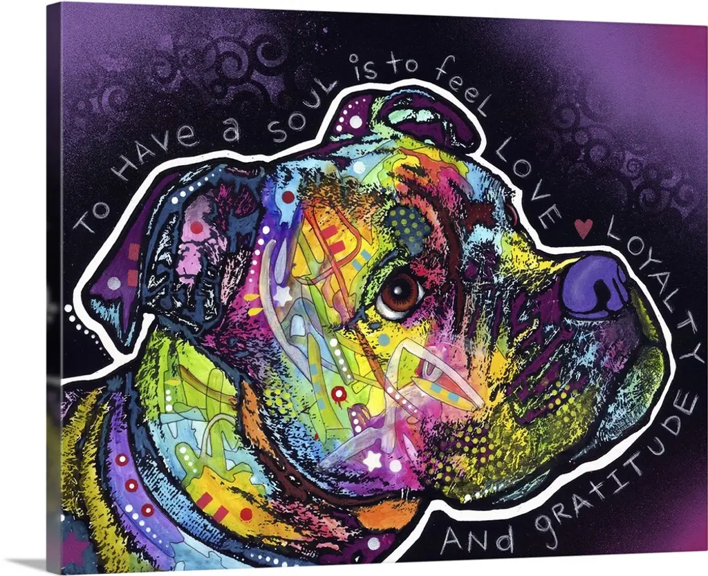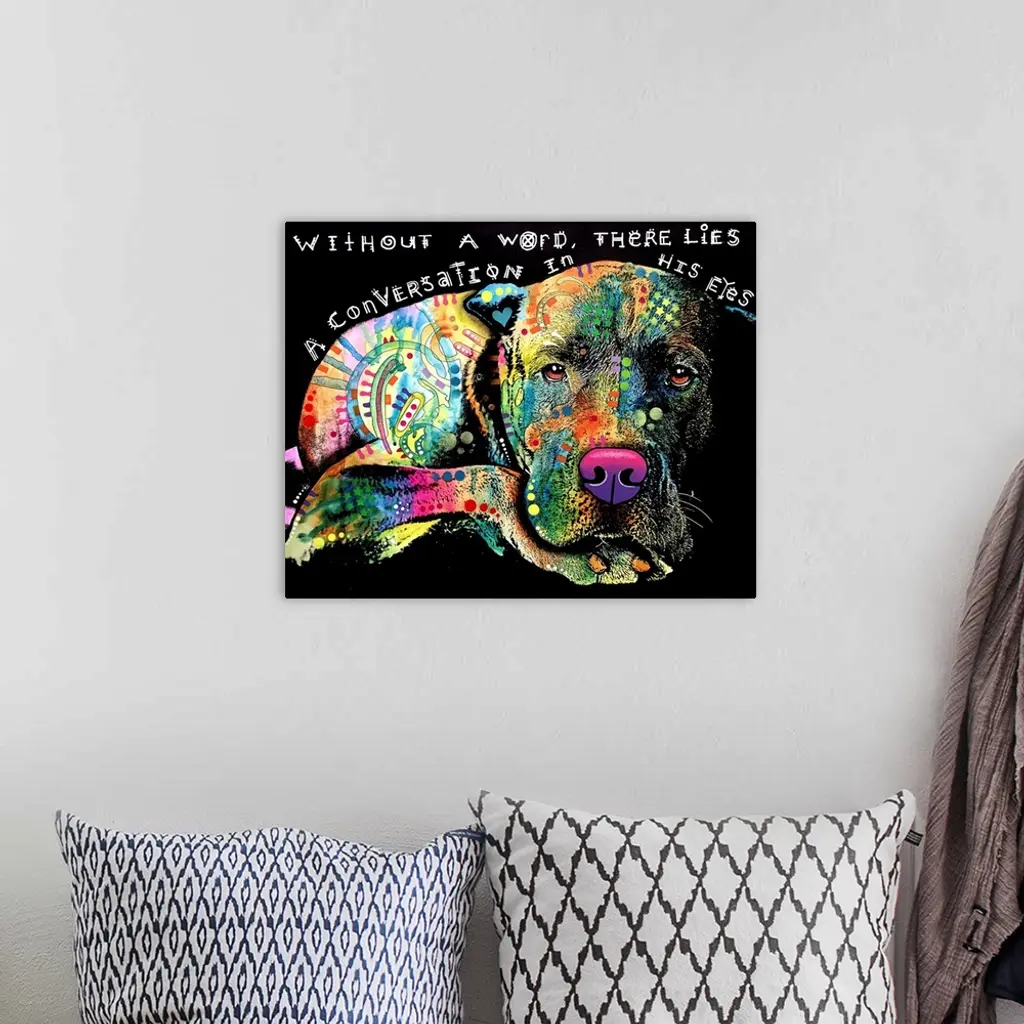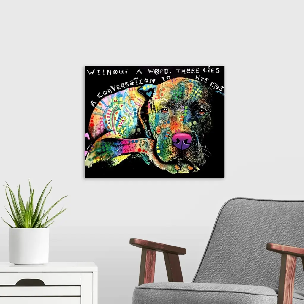 "Without a Word, There Lies a Conversation in His Eyes" handwritten in white above a colorful illustration of a dog laying on its paw on a black background.
