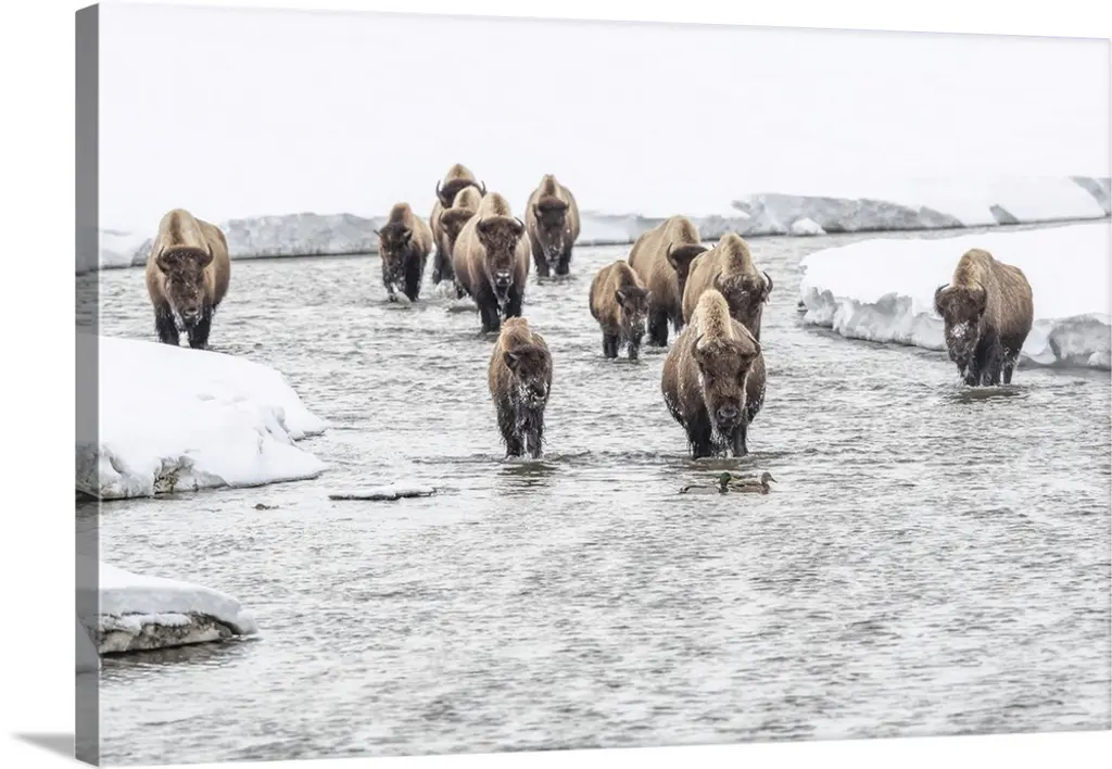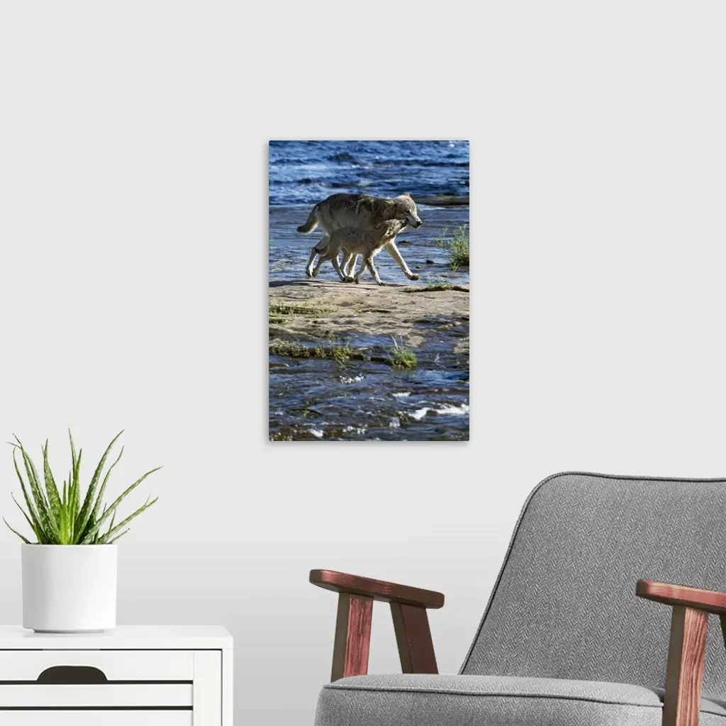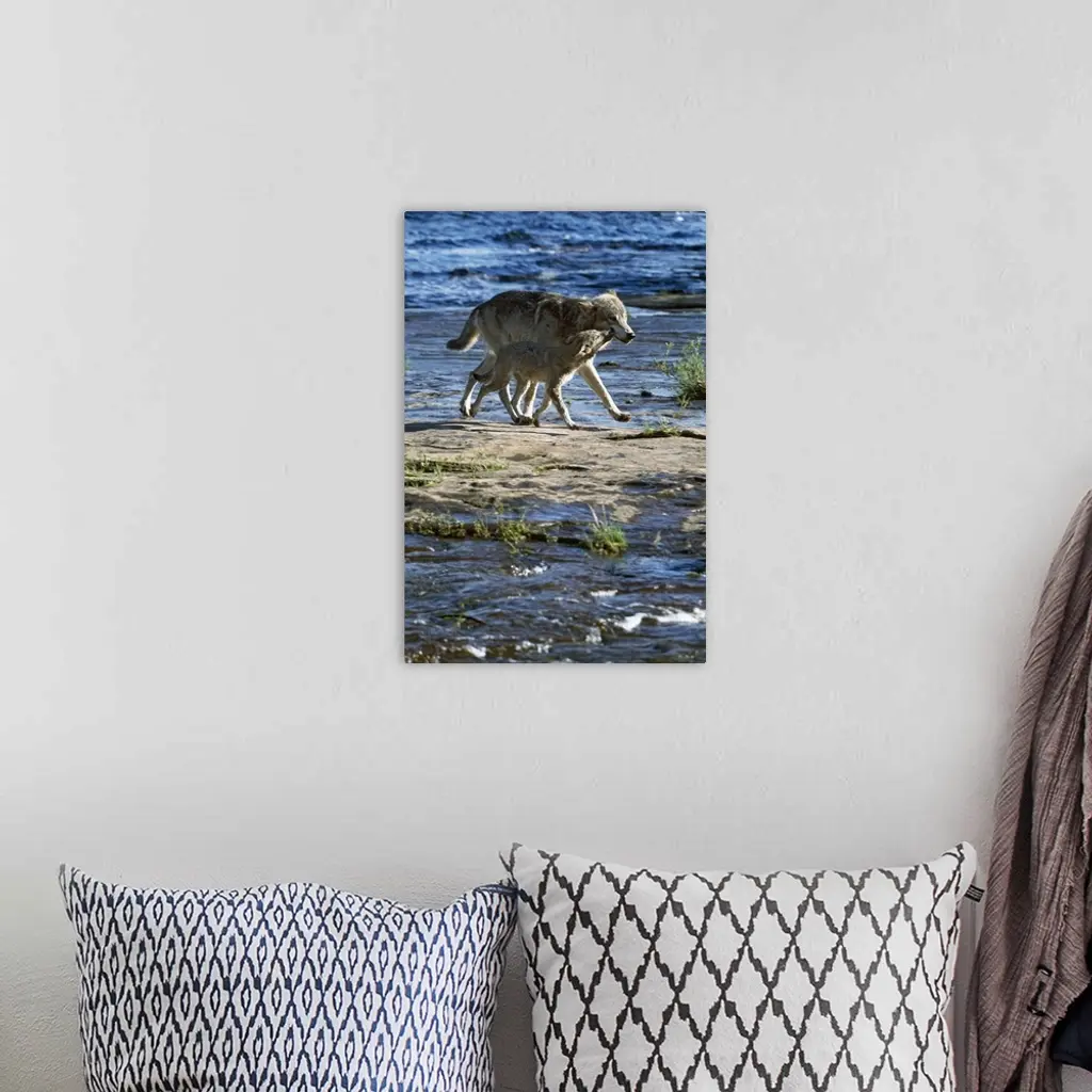 Wolf mother crossing stream with cub, Minnesota wall art for home and office decor. Discover canvas art prints, photos, mural, big canvas art and framed wall art in GreatBigCanvas.com's varied collections.
