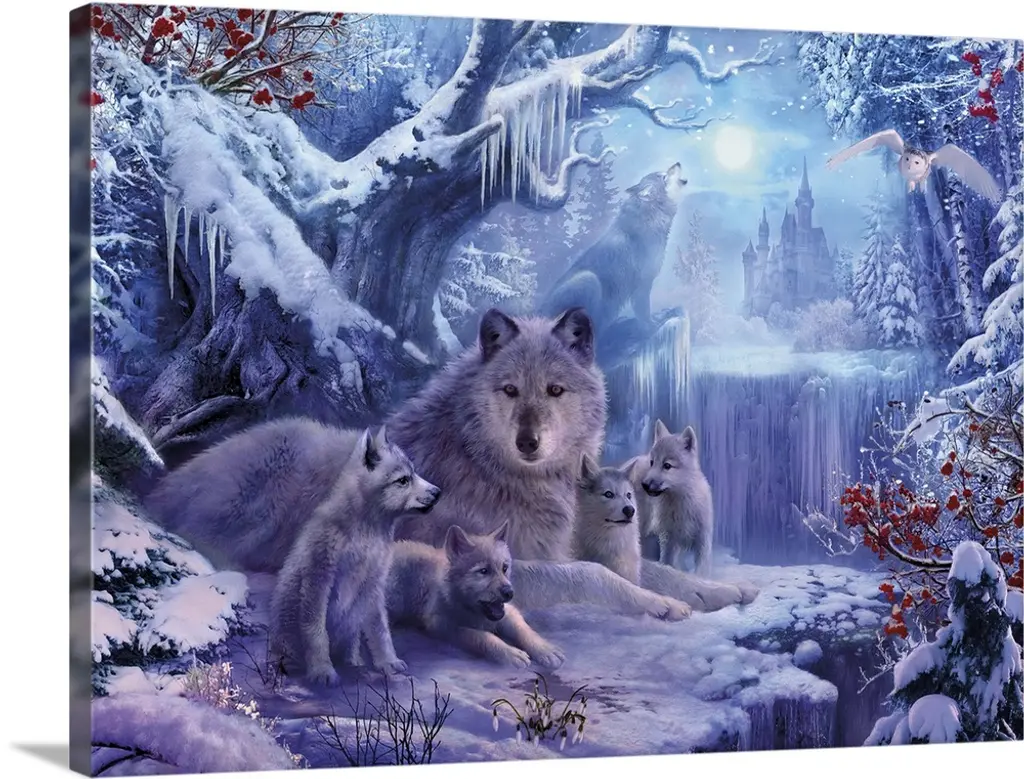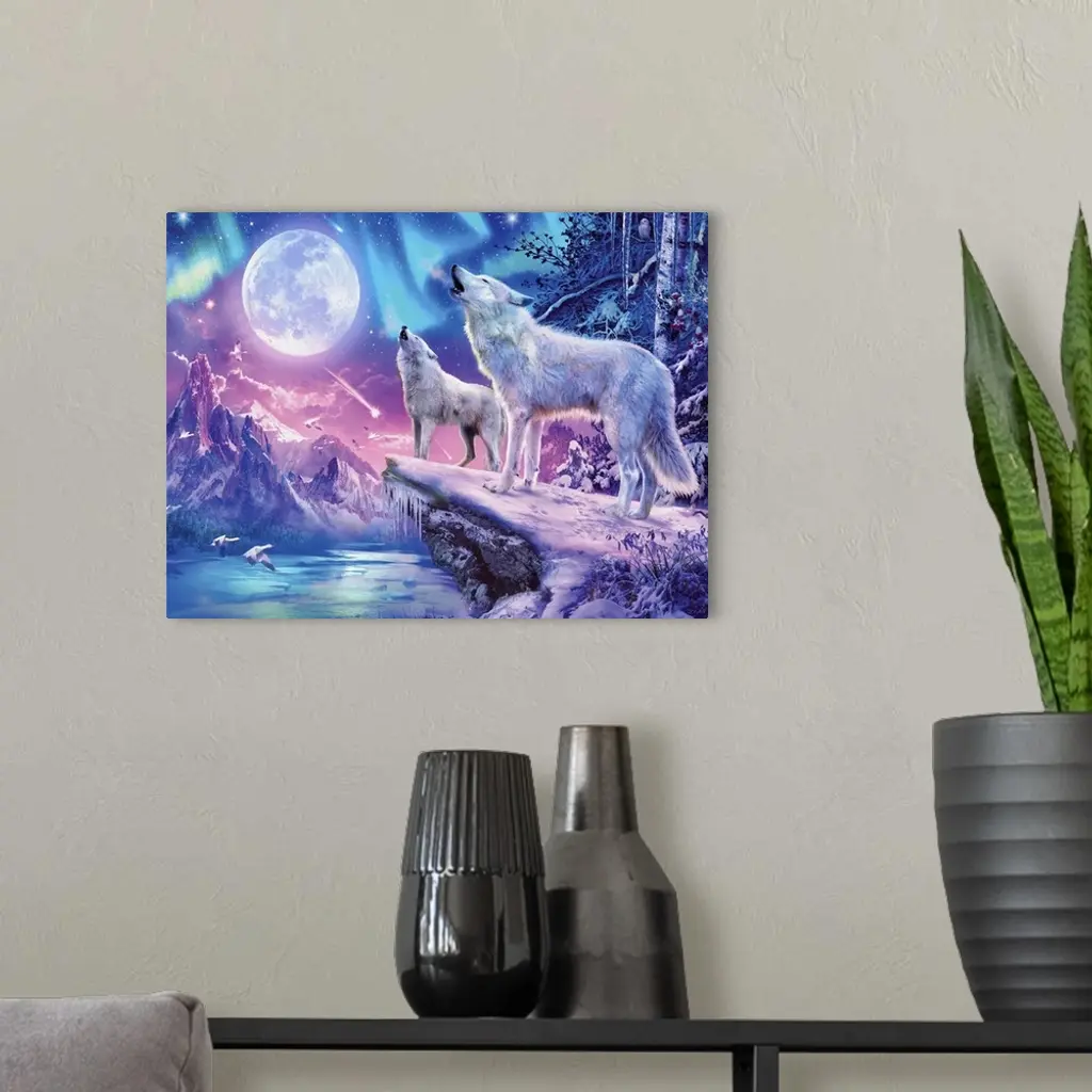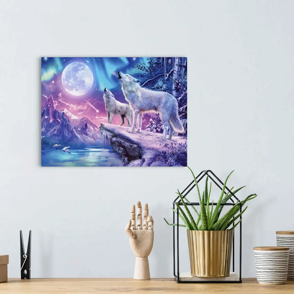Illustration of two wolves howling at the full moon in a snowy mountain scene.