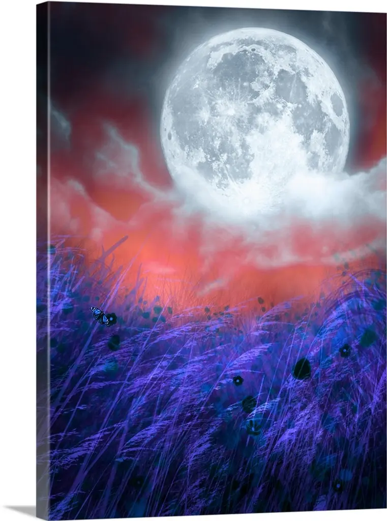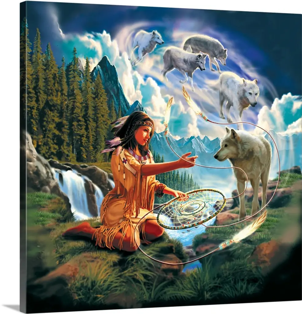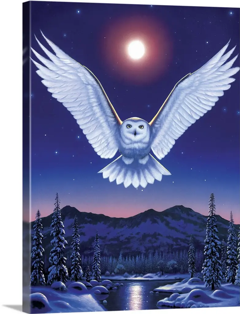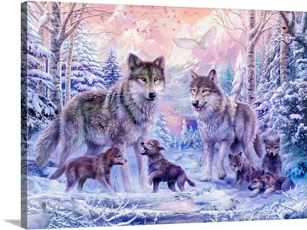 Illustration of two wolves howling at the full moon in a snowy mountain scene.