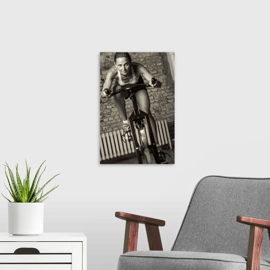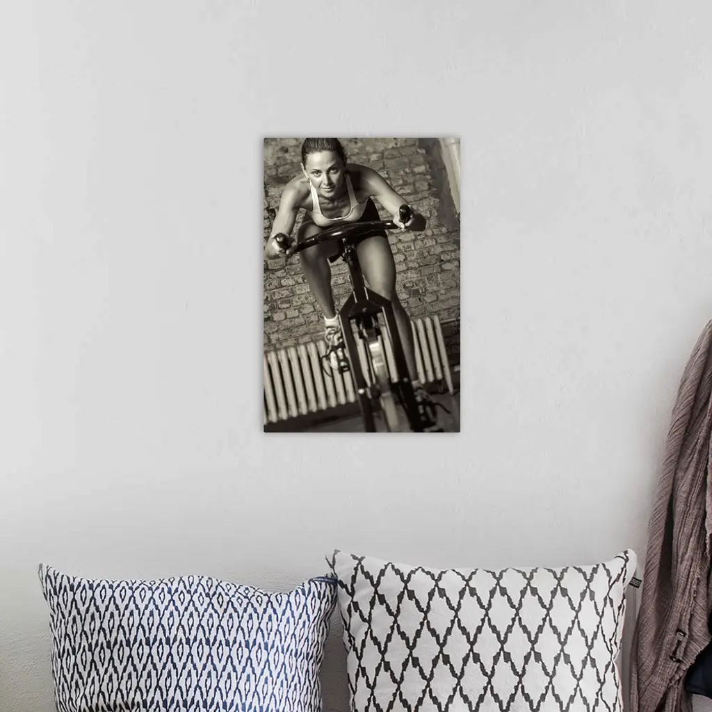 Woman exercising on a stationary bike. wall art for home and office decor. Discover canvas art prints, photos, mural, big canvas art and framed wall art in GreatBigCanvas.com's varied collections.