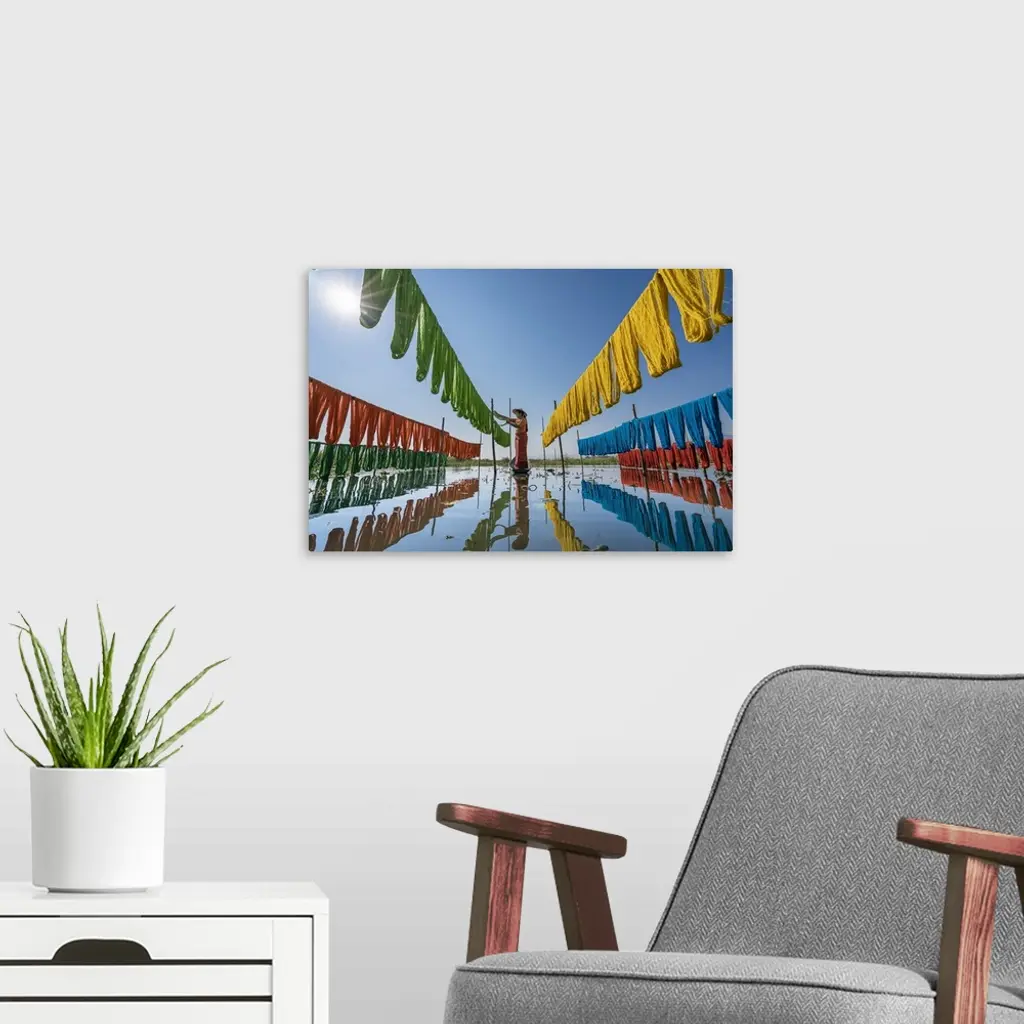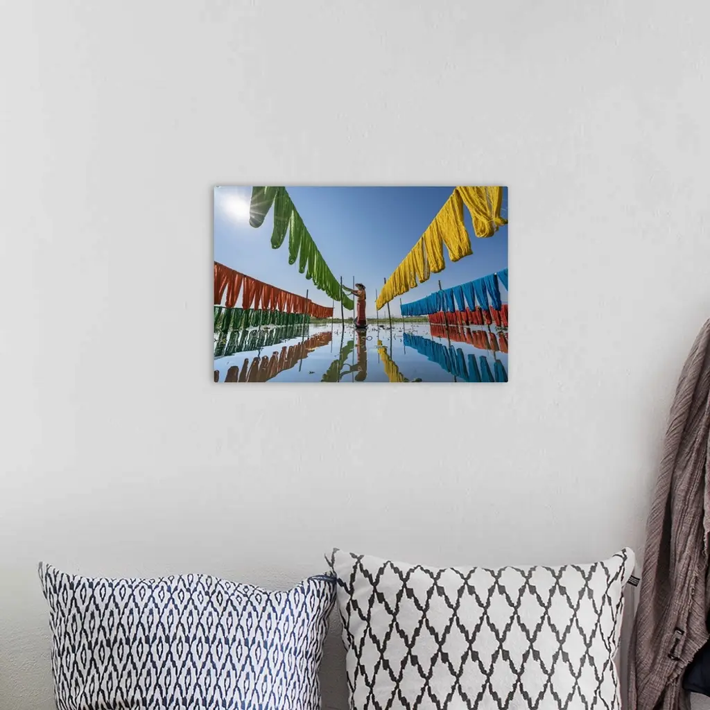 Woman Hanging Dyed Yarn From A Boat To Dry, Lake Inle, Myanmar