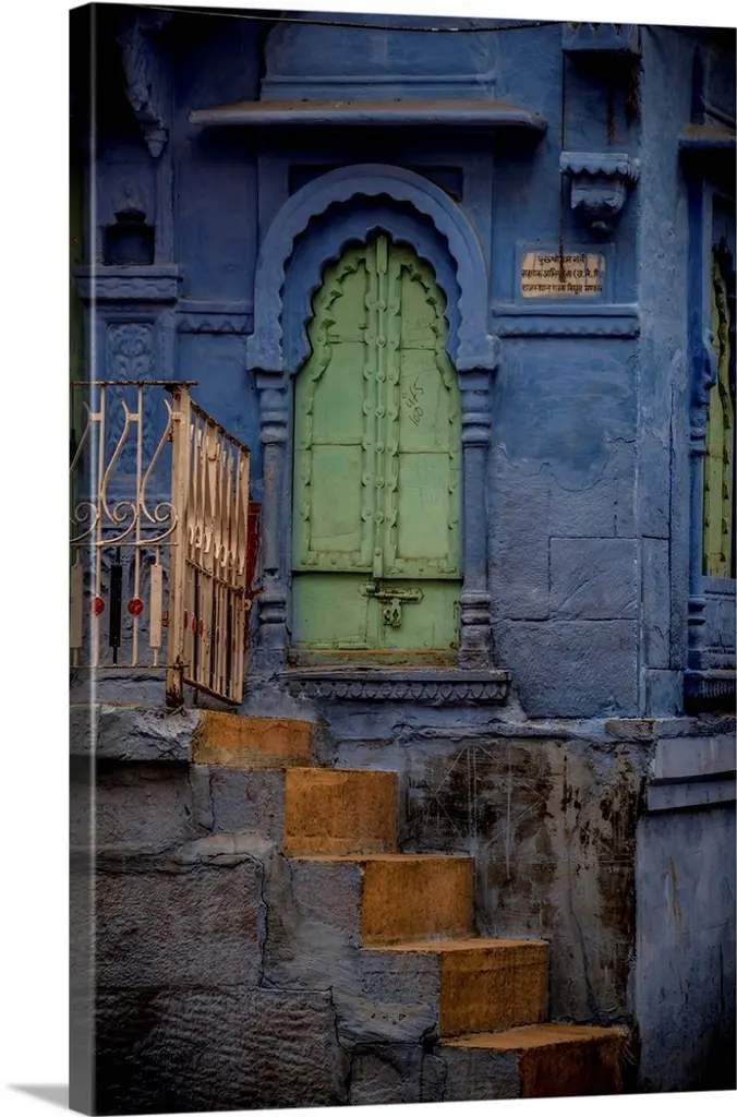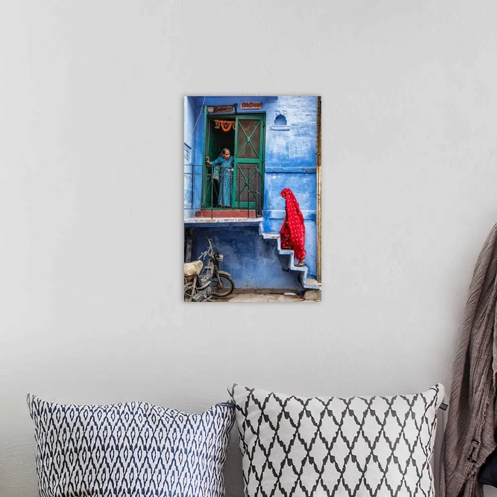 Woman with red Sari walking up steps in the blue city of Jodphur, India.