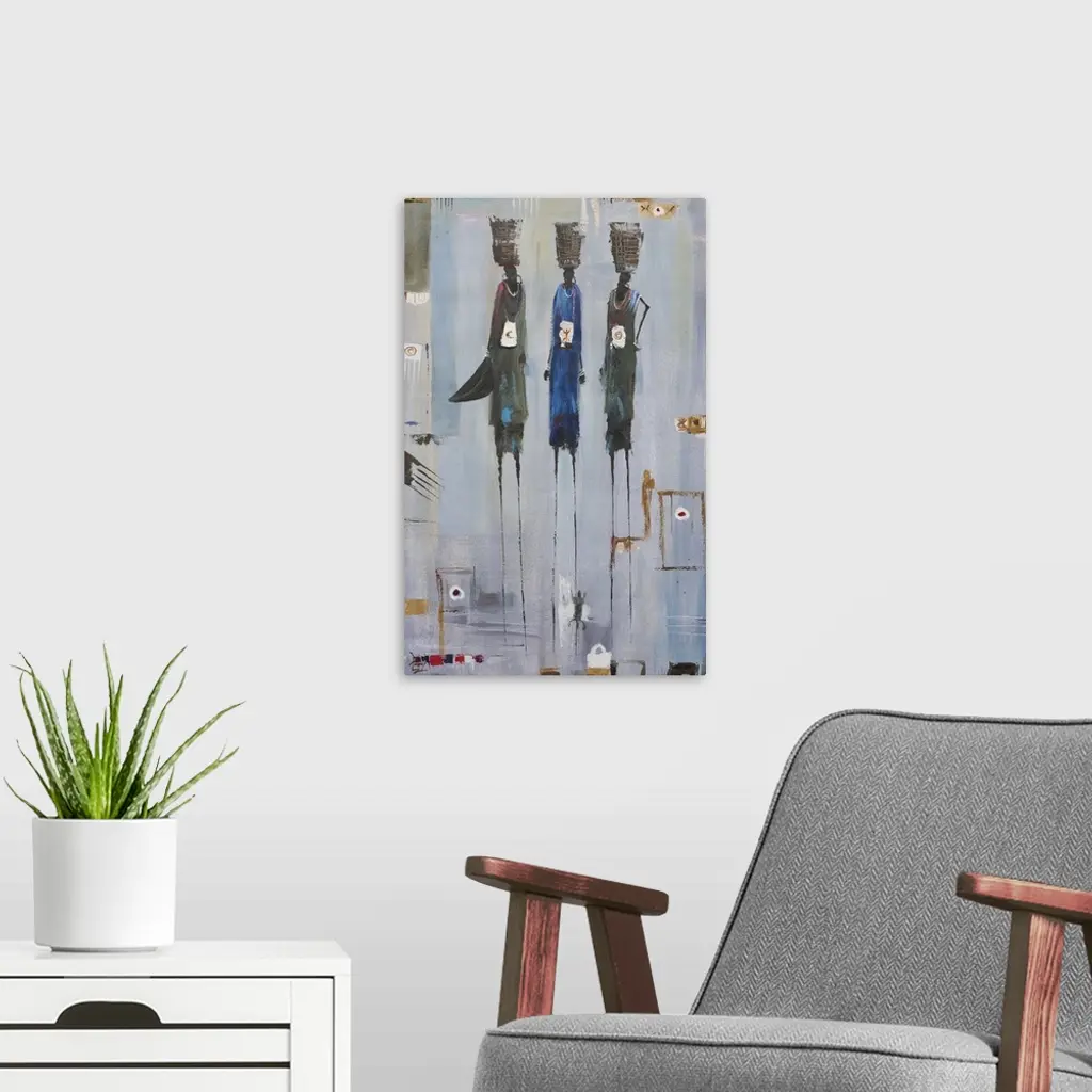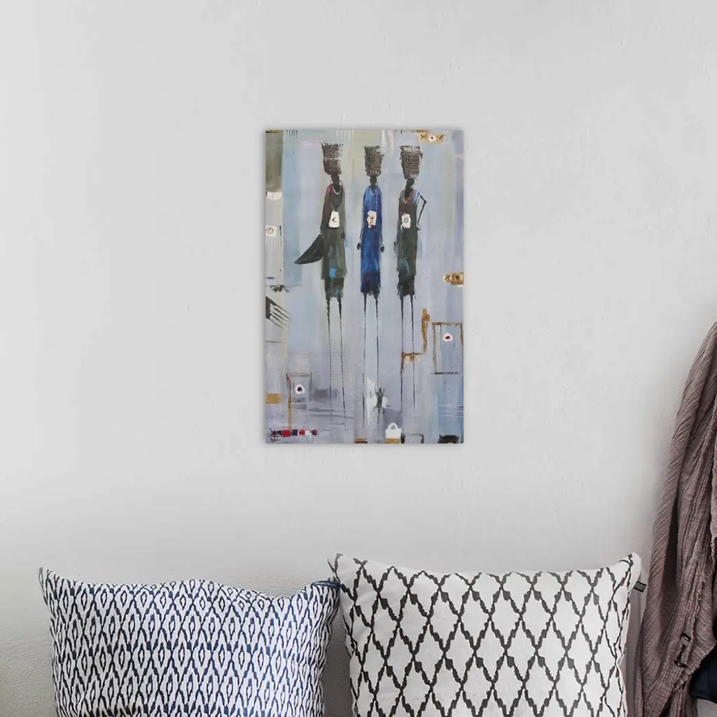 Tall and slender, three women convey strength of character as they stride toward the market in a West African town. The women must take possession of what God has given them and try to work with it, artist Francis Amoah explains. The environment one lives in can also determine the life of a person. These women only have faith in their husbands that things will be okay for the family.