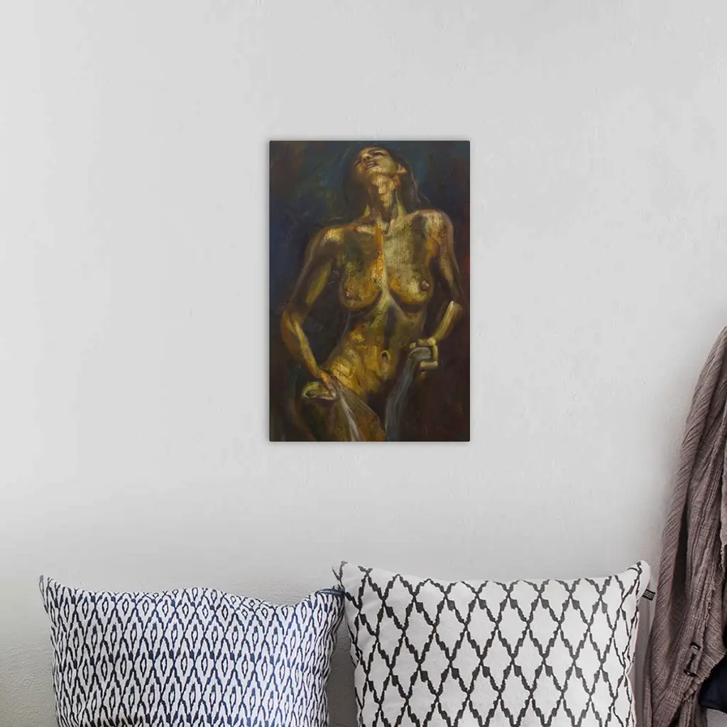 Celebrating a woman's beauty, Aricadia paints a portrait of radiant sensuality. His subject is a young nude who closes her eyes while golden light plays across her face and body. He communicates her innate strength through this superb figure study.