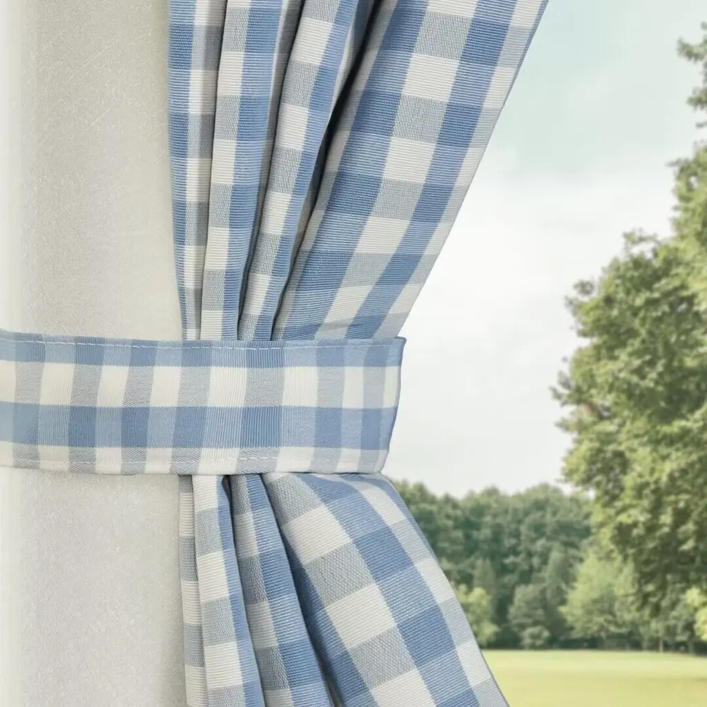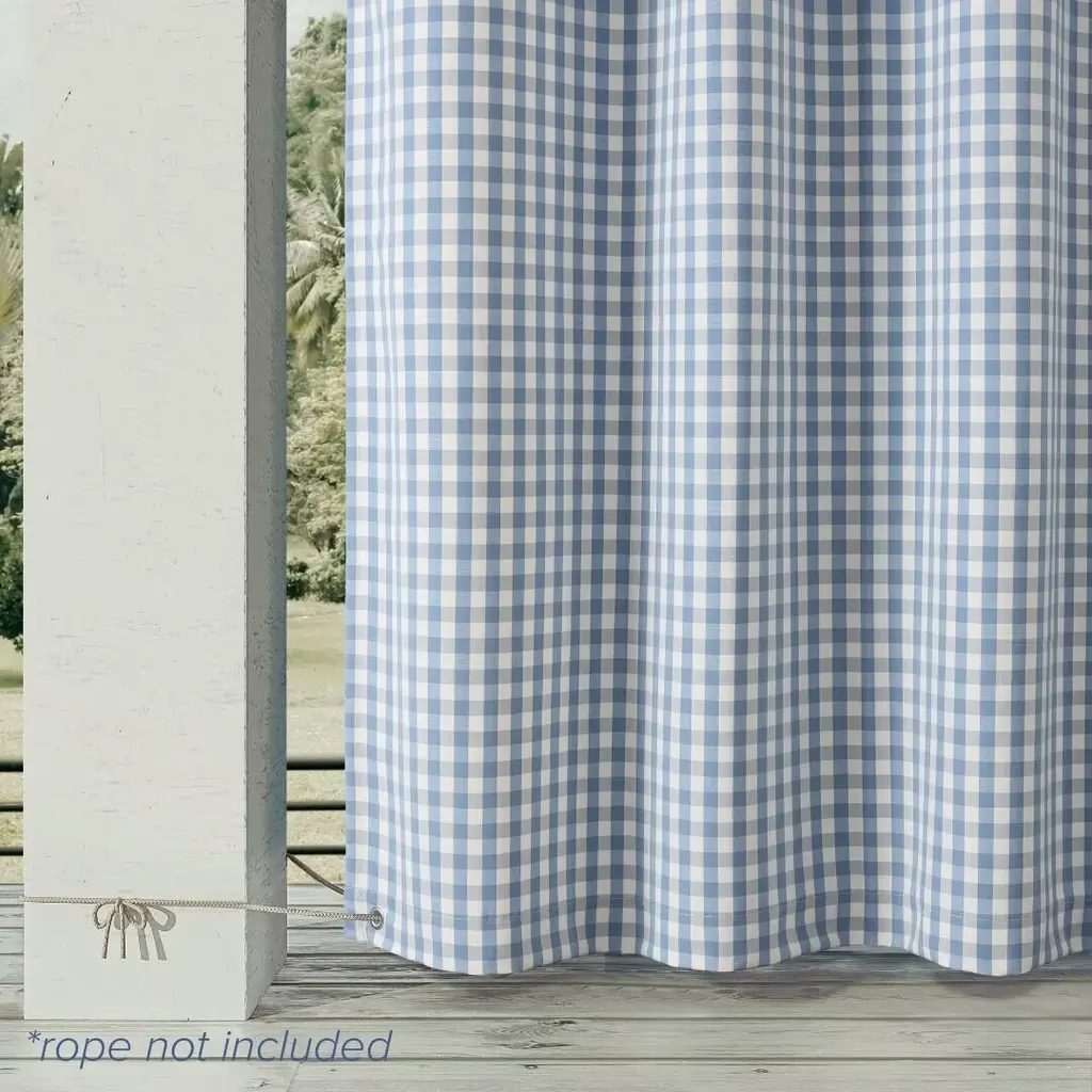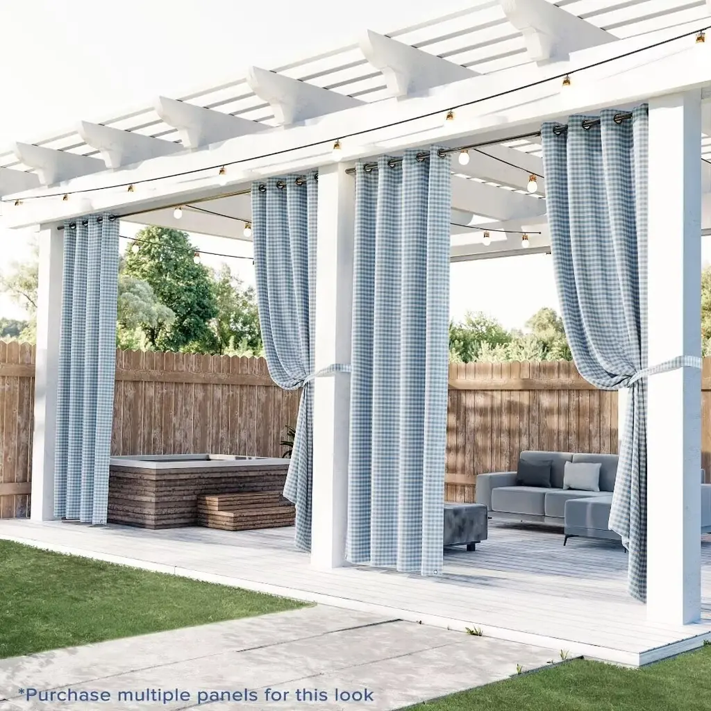 The Wonderland Collection checkerboard outdoor curtain is sold by 1 panel, and each panel includes a tieback. This grommet outdoor curtains will fit both indoor and outdoor living and great for sun blocking, glare reduction and privacy. These durable and water repellent panels will add the finishing touch to any gazebo, cabana, patio, deck, and beach house. Each panel is outfitted with a wind proofing mini grommet in the bottom 2 corners. Features: Dimensions:
