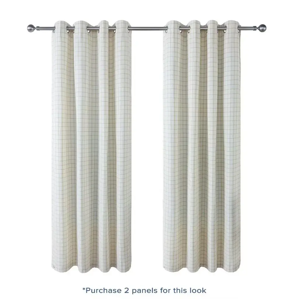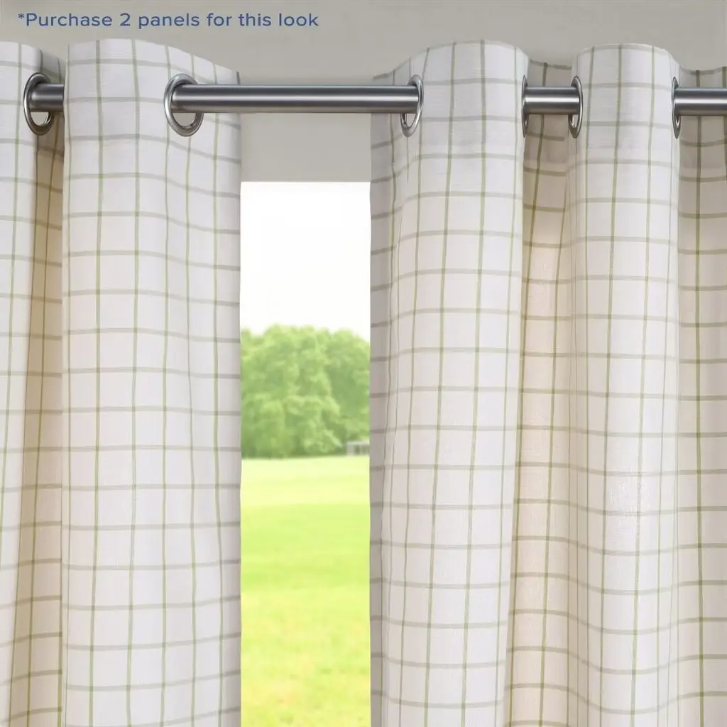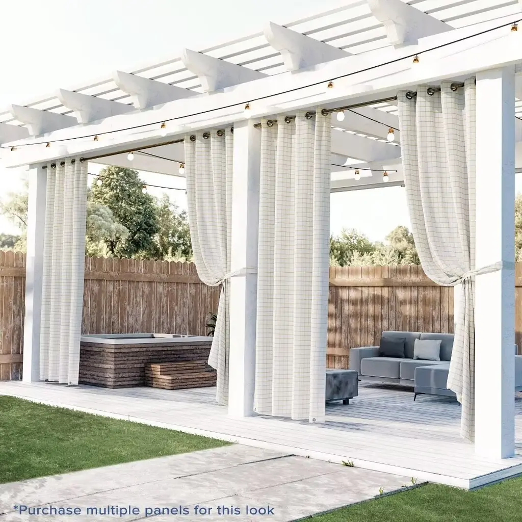 The Wonderland Collection Grid outdoor curtain is sold by 1 panel, and each panel includes a tieback. This grommet outdoor curtains will fit both indoor and outdoor living and great for sun blocking, glare reduction and privacy. These durable and water repellent panels will add the finishing touch to any gazebo, cabana, patio, deck, and beach house. Each panel is outfitted with a wind proofing mini grommet in the bottom 2 corners. Features: Dimensions: