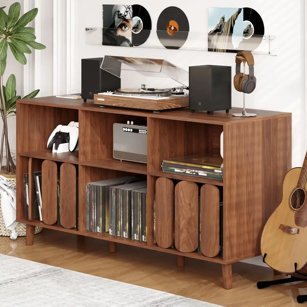 Industrial-modern console table, perfect for displaying your record player, art books, ceramics and more. Three tiers of wooden shelves offer plenty of ways to store your faves, supported by a slim metal frame. Assembly required.